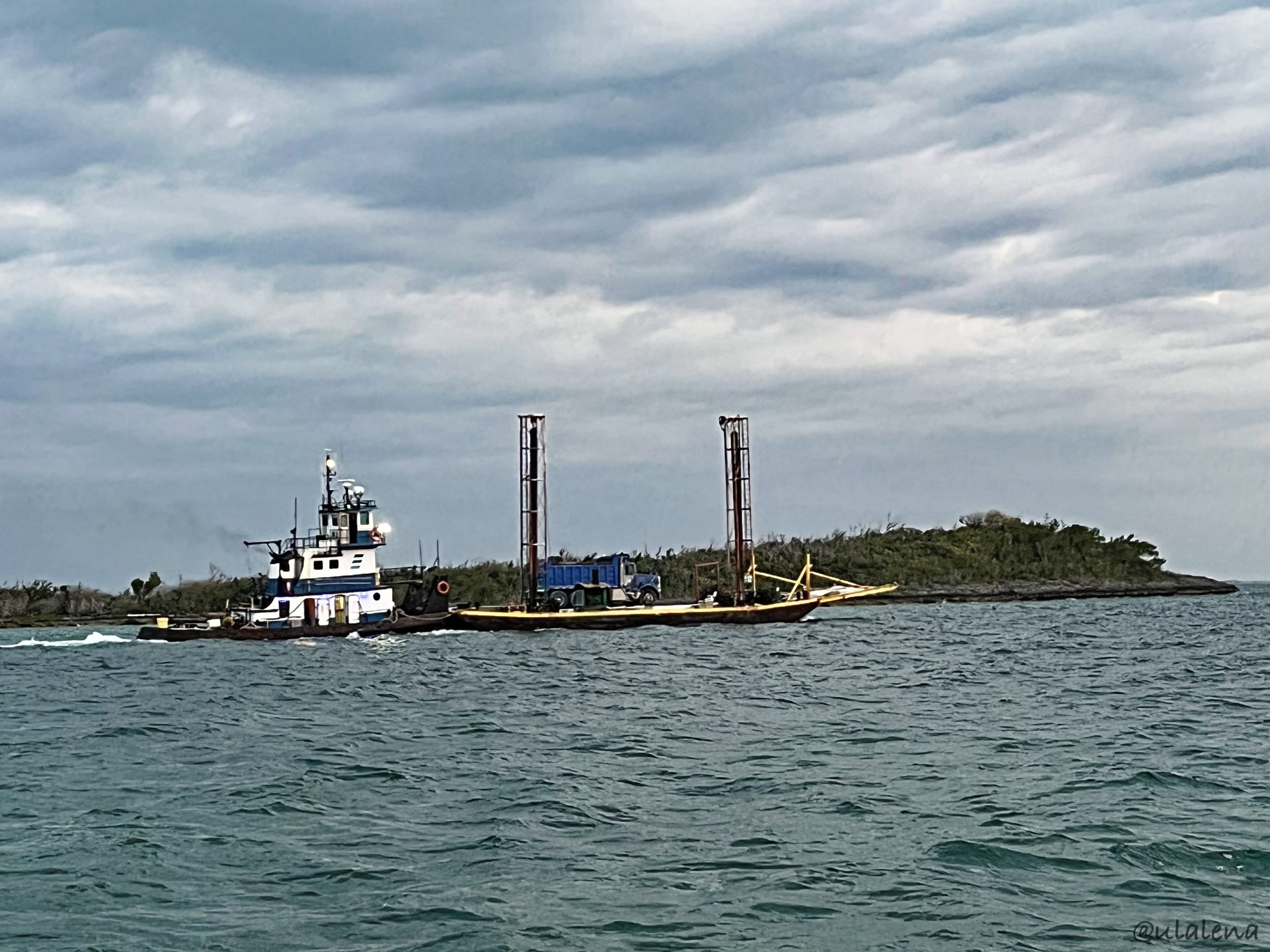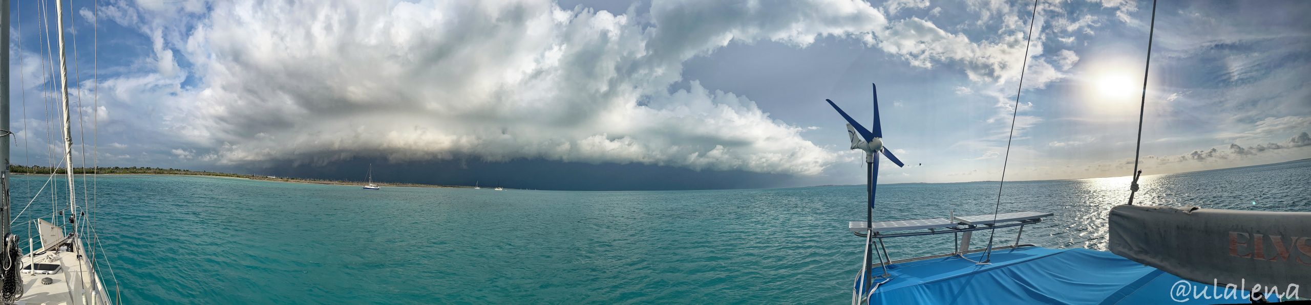 Gute Idee! Denke ich und fülle während des Regens meine Wassertanks. Es schüttet dermassen kurz und heftig, dass mein Wasserreservoir rassig wieder voll ist. Gräme! Schon kommt das Blau hervor und ich mache mich auf zum nächsten Ankerplatz. Das Wasser, Wind ist perfekt, um den Wal zu bezwingen. Alle machen einen riesigen Hype um diese Passage. Kurz etwas raus in den “grossen” weiten Ocean und nach zwei ganzen Meilen wieder zurück in die geschützte Abdeckung. Etwas segeln und Motoren und schon sehe ich das nächste Ziel. Great Guana Cay. Es soll eine gut geschützte Bucht haben. Trotz des Westwindes soll es recht angenehm sein. Eine Nacht, eine Nacht geht doch immer 😉 Die erste, Bakers Bay ist mir etwas gar zu offen und so lege ich mich vor dem Delia’s Cay vor Anker. Passt. Schön einfahren, das Ding. Gerade vis a vis vom Government Dock ist es gar nicht so schlecht. Doch die sind gerade am Ausladen von Kies. Kein Problem und eigentlich eine gute Unterhaltung. Etwas Essen und zuschauen. Der Wind, ja der dreht immer mehr nach Westen, was gar nicht so schlecht ist, aber langsam kommen die Wellen vom Wal daher. Diese Öffnung ist schon okay, aber die Wellen von draussen schleichen sich der ganzen langen Insel entlang und treffen somit ich auf die Ulalena. Liege ja genau im Wind und somit ungeschützt. Endlich sind die Schiffer fertig und auch ich verziehe mich unter Deck.