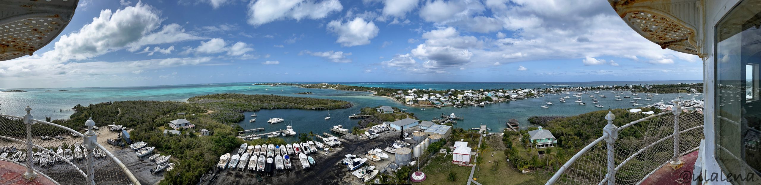 Am Nachmittag wollen wir los. Den Turm haben noch immer nicht gesehen, geschweige denn, bestiegen. Jetzt ist die richtige Zeit und wir machen uns hübsch. Die besten Sachen holen wir aus dem Schrank und rudern zum Steg gleich unterhalb des Turms. Kurzer Ausflug im Souvenir-Shop und ab gehts zum Eingang. Kasse? Eintritt? Nix, aber wir spenden für die Erhaltung dieses wunderschönen Bauwerks. Die hundert Treppen sind bald erklommen und dann sehen wir die ganze Pracht des Dorfes, Insel und des Meers. Elbow Reef