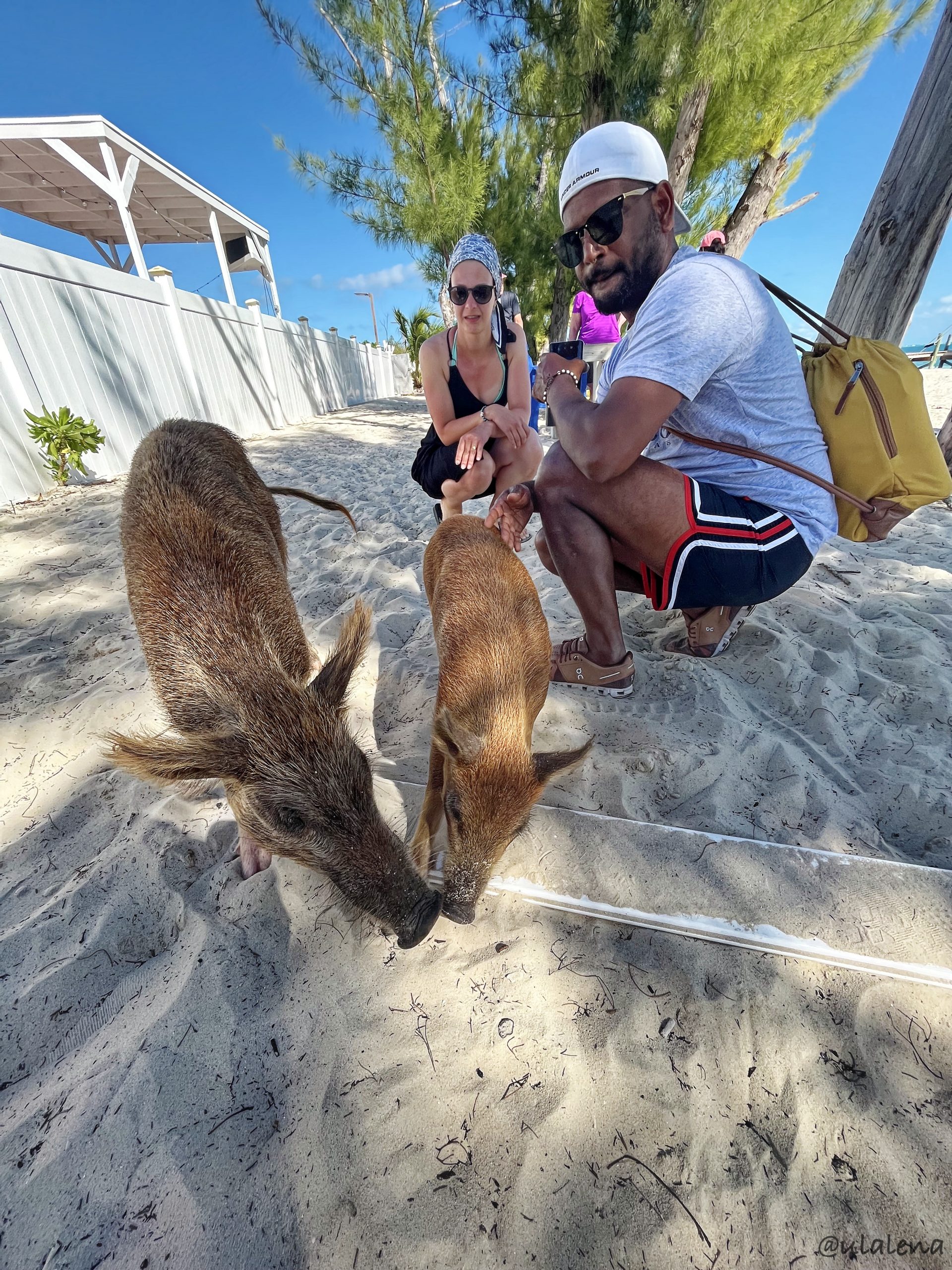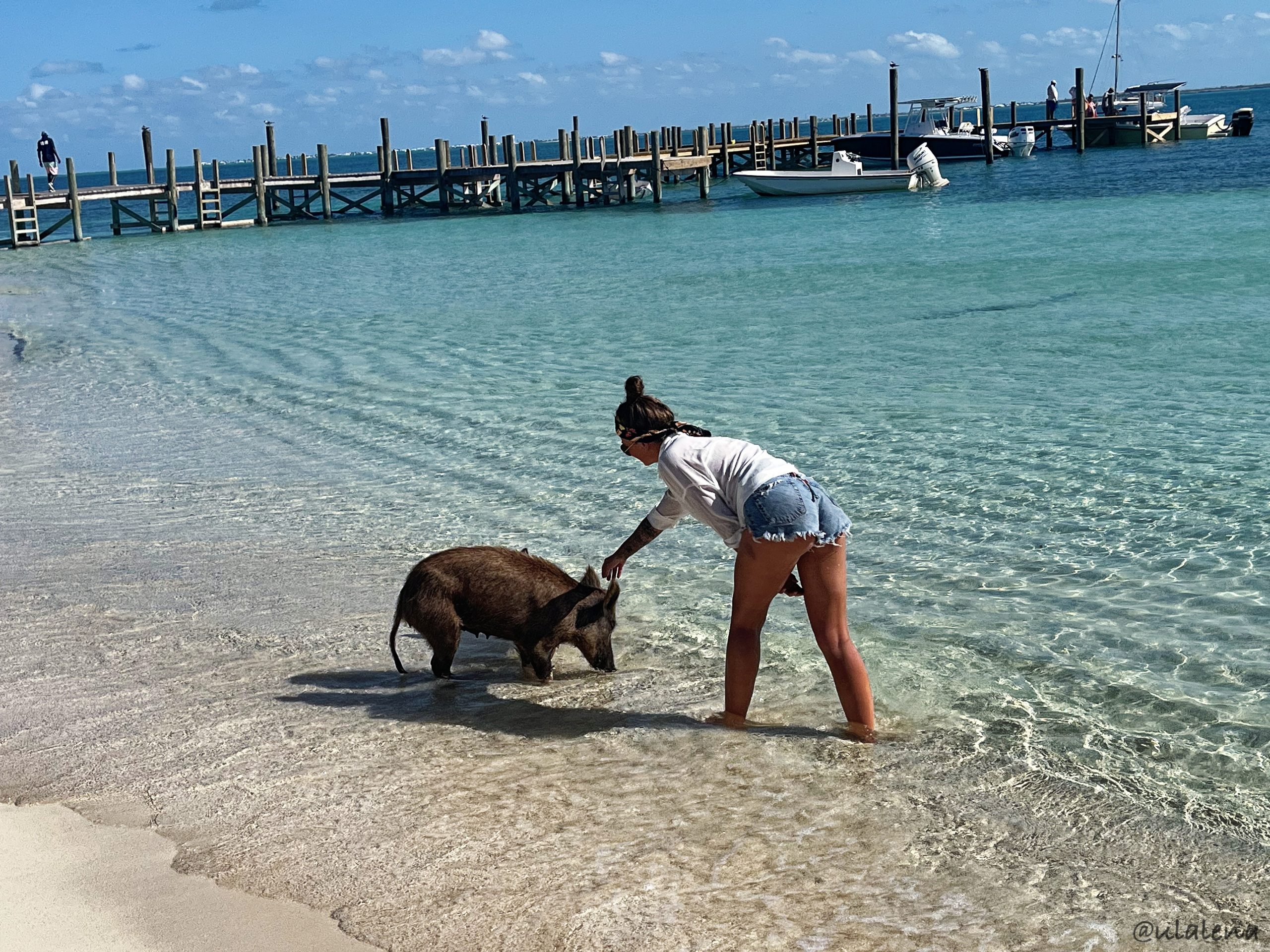 Ab aufs Meer, ist das Motto des nächsten Tages. Wir sind ein paar Meilen südlich des berühmt, berüchtigten Whale Cay. Nur ein paar Meter aus dem riffgeschützten Bereich und schon tanzen die Wellen um uns herum. Wir heute mit dem Anspruch, nur Segeln ist schöner, versuchen bis zum Noname Cay alles zu geben. Das heisst, so ist es vorgesehen und funktioniert recht gut. Das Misstrauen gegenüber dem raumen Kurses bleibt Dauerthema und alle Beweise laufen zunächst ins Leere. Doch es wird besser und das Vertrauen des Steuermanns wird immer besser. So schmeissen wir das Eisen nach einem grandiosen gesegelten Tag direkt vor Noname Cay und der Beiz Big O’s in den feinen Sand. Diese Insel hat nur eines, Schweine am Strand! Wenn man sie füttert, schwimmen sie sogar im Meer. In den Exumas hatten wir ja den Spass, dieses schräge Vergnügen zu beobachten. Hier ist es fast identisch, aber viel, viel ruhiger und angenehmer diese borstigen Tiere zu streicheln.