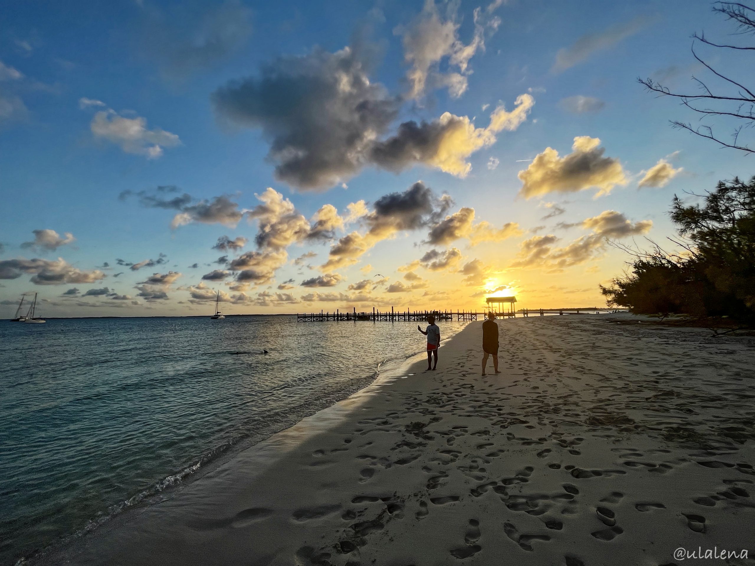 Die Nacht war etwas wellig. Mehr oder weniger haben die Wellen uns gefunden. Nicht schlimm und so geniessen wir die morgendliche Ruhe. Essen gediegen unsere neuen, feinen, leckeren Pancakes. Anker hoch! Es ist bereits zehn Uhr, als wir die Bucht verlassen. Der Wind ist wirklich gut und passt für unseren weitern Weg nach Norden der Abacos. Entlang des Fowl Cays National Parks steuern uns ein erstes Mal Eric mit halbem Wind gegen Great Guana Cay, der Partyinsel entgegen. Kaum Segel Gesetz, sind wir da. Bergen sie und umrunden mit dem Motor den Delia’s Cay. Finden einen schönen, ruhigen Platz vor dem Grabber’s und werfen den Anker. Schön einfahren und aussteigen. So wollen wir uns die Nipper’s Bar und die Grabber’s Bar etwas genauer anschauen. Was für eine andere Welt. Bis jetzt hatten wir das Gefühl, allein auf den Abacos zu sein, was sich nun schlagartig ändert. High-Life ist angesagt und das mitten am Nachmittag. Ein paar Drinks und die wunderbare Aussicht aufs Meer geniessen. Doch es ist etwas schräg, mit all den Leuten. Ein Besuch im Shop muss natürlich sein. Kaufen aber keine kubanische Zigarre, sondern ein praktisches UV-T-Shirt für Joel. Ziehen weiter durch den kleinen lebhaften Ort und kehren im Grabber’s ein. Hier passt es etwas besser. Schön am weiten, sandigen Strand gelegen mit guter Musik, die aber etwas zu laut ist. Eine Bestellung direkt unter den Boxen aufzugeben ist etwas mühsam. Nicht schlecht ist der “Zwipf”, doch die Rechnung ist wahrlich gesalzen. Echt? Es wird bald dunkel und so schlendern wir zurück zur Banane. Beim Reintragen, passt doch zur Insel, fräse ich mir einen rostigen Nagel in meine Fusssohle. Neiiiii! Etwas desinfizieren und zurück zum Boot. Eine gewaltige Stimmung erleben wir hier vor Anker. Fast alle Farben des Regenbogens werden in der Himmel gezeichnet.