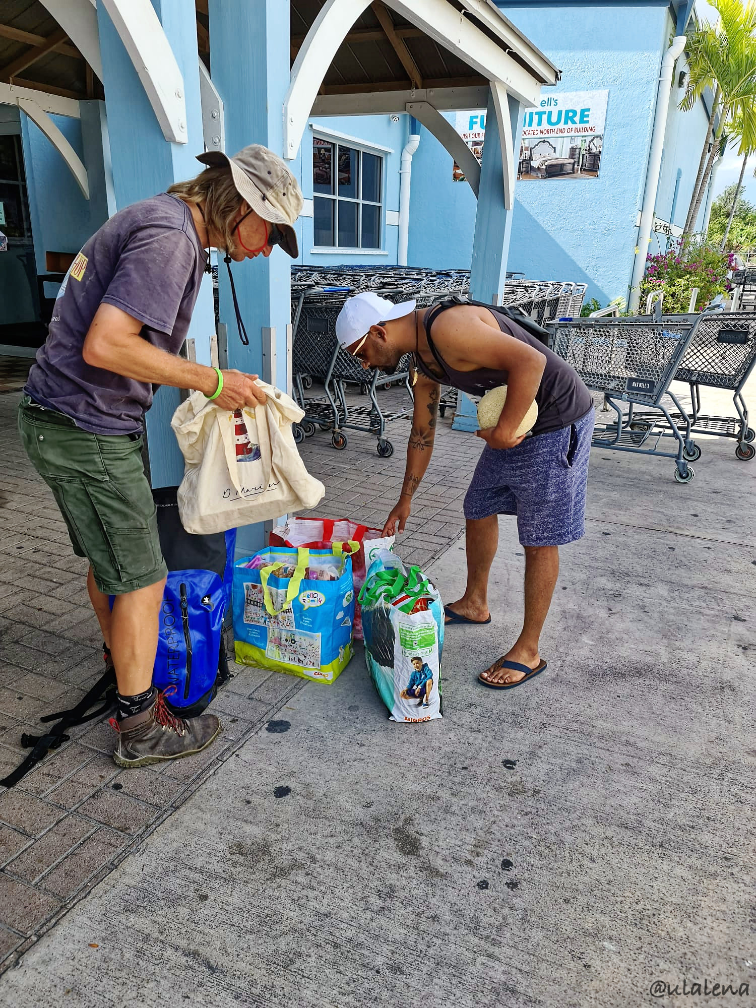 Die Eier und der Kafi schmecken am nächsten Morgen besonders gut. Die Gäste haben lang geschlafen und so sitzen wir im Cockpit und haben uns viel zu erzählen. Dazu sollten wir noch eine Liste für den anschliessenden Einkauf erstellen. Alles zusammen? Drei Taschen haben wir und wieder wird gerudert. Direkt an den Strand und in den Sand, setzen wir unser Gefährt. Alle Taschen müssen mit. Weit ist es nicht, doch der staubigen Strasse entlang ist nicht ganz ohne. Tatsächlich hat der Maxwell’s am heutigen Feiertag, Ostermontag, offen. Wie im Schlaraffenland, doch ich habe alle auf die nicht günstigen Preise hingewiesen. Es gibt hier zwar fast alles zum Kaufen, doch die Preise sind fast so wie in der Schweiz oder sogar noch teurer. Wie können sich die Einheimische das alles nur leisten? Die müssen ja Saläre haben wie die Fürsten. Alles gefunden und bereit, um nach der Kontrolle einzupacken.