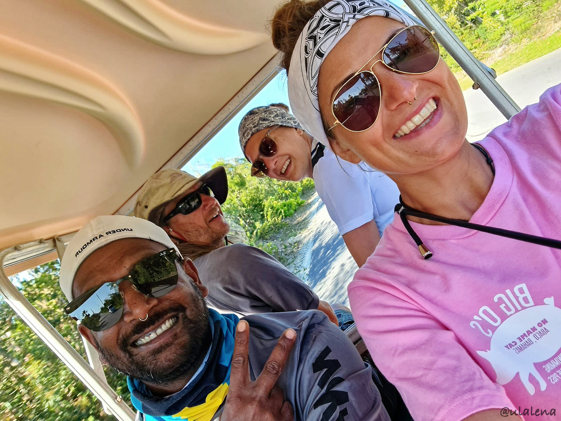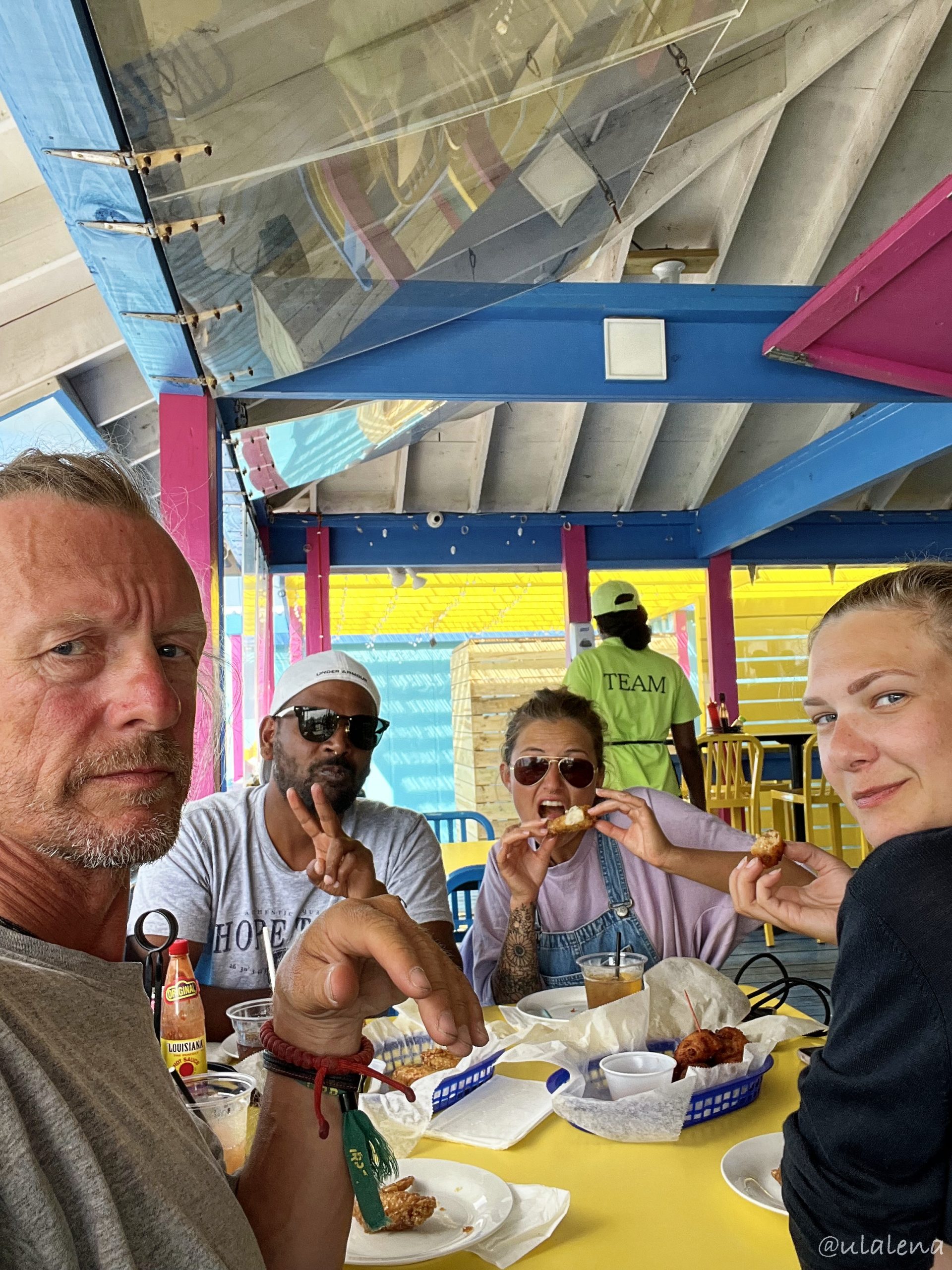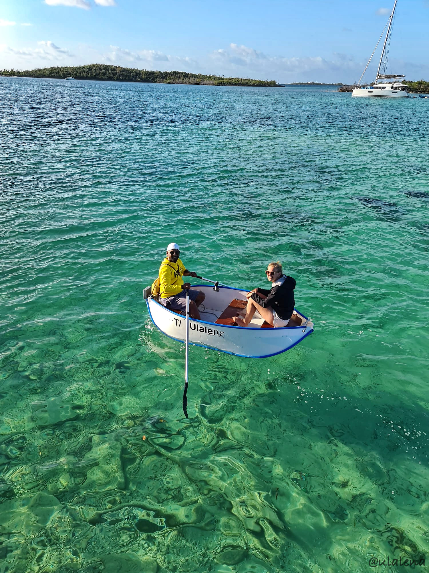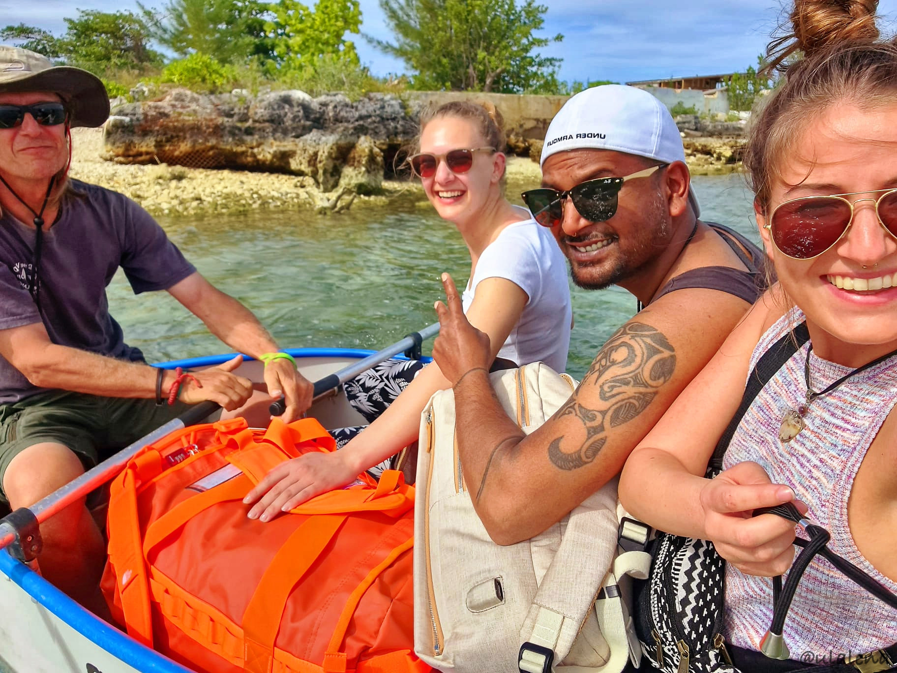 Sie kommen! Sind bereits gelandet und es dauert ewig, bis ich meine Tochter in den Arm nehmen kann. Ist das schön, euch alle hier zu haben. Das war ja echt eine Herausforderung, das Boot ganz in die Abacos zu segeln, überhaupt hereingelassen werden und mit dem berühmten Tüpfelchen auf dem I, die ganze Mannschaft hierhin zubekommen! Ausserordentlich! Jetzt sind sie da und ich möchte alle Drei eigentlich nicht mehr loslassen. Doch ich will ihnen ja dieses “Paradis” etwas genauer zeigen. Das Gepäck ist auch eingetroffen und so organisiere ich schon mal ein Taxi. Klappt nicht so ganz, doch wir können bei einem anderen Taxi, der in dieselbe Richtung fährt, mitreiten. Super. Auch der Preis ist gut. Passt! Einladen ins kleine Dinghy. Haben denn auch alle Platz? Geht so. Die Wellen sind heute zum Glück kaum vorhanden und so wird unsere “Gigelfuhre” relativ trocken zur Ulalena gerudert.