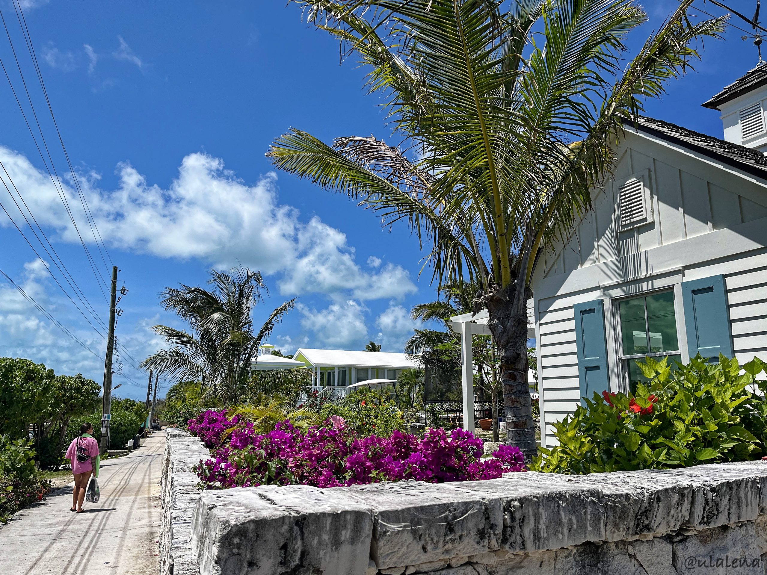Jetzt aber weiter. Es ist schon wieder Samstag und wir haben von dieser Insel, den Abacos, eigentlich noch nicht viel gesehen. Die Tide kommt und so lasse ich unsere kleine Boje los. Die Mädels steuern uns den engen Kanal hinaus und zur nächsten Insel. Im Norden von MoW, Man-o-War, gibt es eine wunderschöne Bucht zum Ankern. Kaum sind wir über die Untiefen raus, setzen wir die Segel und rauschen mit Halbwind nach Norden. Rund um Sandy Cay und rein in die Bucht. Herrlich! Setzen den Anker oder versuchen es zumindest. Denn er hält nicht, rutscht weg und wir treiben in Richtung Riff. Nochmals hoch und dann finden wir Halt. Ein Nachbar unterrichtet uns, dass es weiter am Strand mehr Sand hat und es wesentlich besser hält. Doch für eine Nacht sind wir mehr als zufrieden. Was kleines Essen. Die schöne Umgebung mustern. Das Dinghy ins Wasser lassen und das Dorf erkunden gehen. Es ist wahrlich ein schöner Weg, der uns zum kleinen Dorf führt. Die Blumen, Häuser und der Strand auf beiden Seiten. So finden wir uns bald im Dorfladen wieder und kaufen zusätzlich frische Sachen fürs Znacht. Über den Oststrand spazieren wir zurück zum Boot. Baden, Schnorcheln, Sonnenbaden bis es dunkel wird. Unser Koch bastelt erneut ein Hammer-Essen für den Abend. Wir schlemmen wie die Fürsten 😉