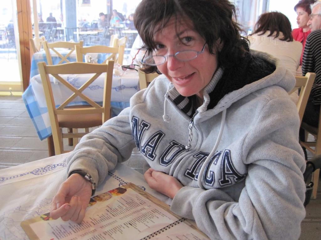 Hunger und nach dem “langen” Regen sind wir auch schon zurück in Preveza. Wir parkieren auf dem grossen Platz und suchen uns einen warmen, trockenen Ort. Es ist zwar noch früh, aber wir hatten Heute noch nichts zwischen den Zähnen. Gaby studiert schon mal die Karte.