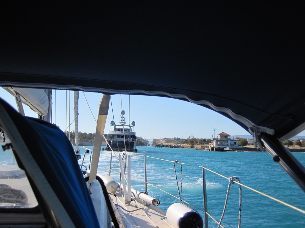 Wir sind um sieben schon wieder wach. Funk auf Kanal 11 einschalten und das AIS dazu. Was kommt auf den Kanal zu und wer meldet sich an. Ein grosses Motorboot hat kurz vor der Einfahrt geankert und ruft den “Korinth Canal” auf. Dazu sehen wir noch einen grösseren im Anmarsch vom Westen. In zehn Meilen ist er auch da. Alles bereit machen und raus, aus unserem ruhigen Platz. Der Wind bläst aber immer noch gehörig, aber der wird uns hoffentlich nicht stören. Vielleicht die Wellen bei der Einfahrt. Wir machen uns bereit und schon um acht kommt der Anker hoch. Alles besten und ohne an einer Muring hängen zubleiben, verlassen wir den Hafen. Die leinen und Fender lassen wir noch draussen, müssen wir doch nach der Durchfahrt seitlich am Pier festmachen und haben dort nicht viel Platz und Zeit. Aufruf mit unseren Angaben an “Korinth Canal” und wir können den anderen beiden folgen. Das passt ja hervorragend! Der schwarzen Motorjacht sollen wir folgen, wird uns gefunkt. Los gehts und raus aus den Wellen.