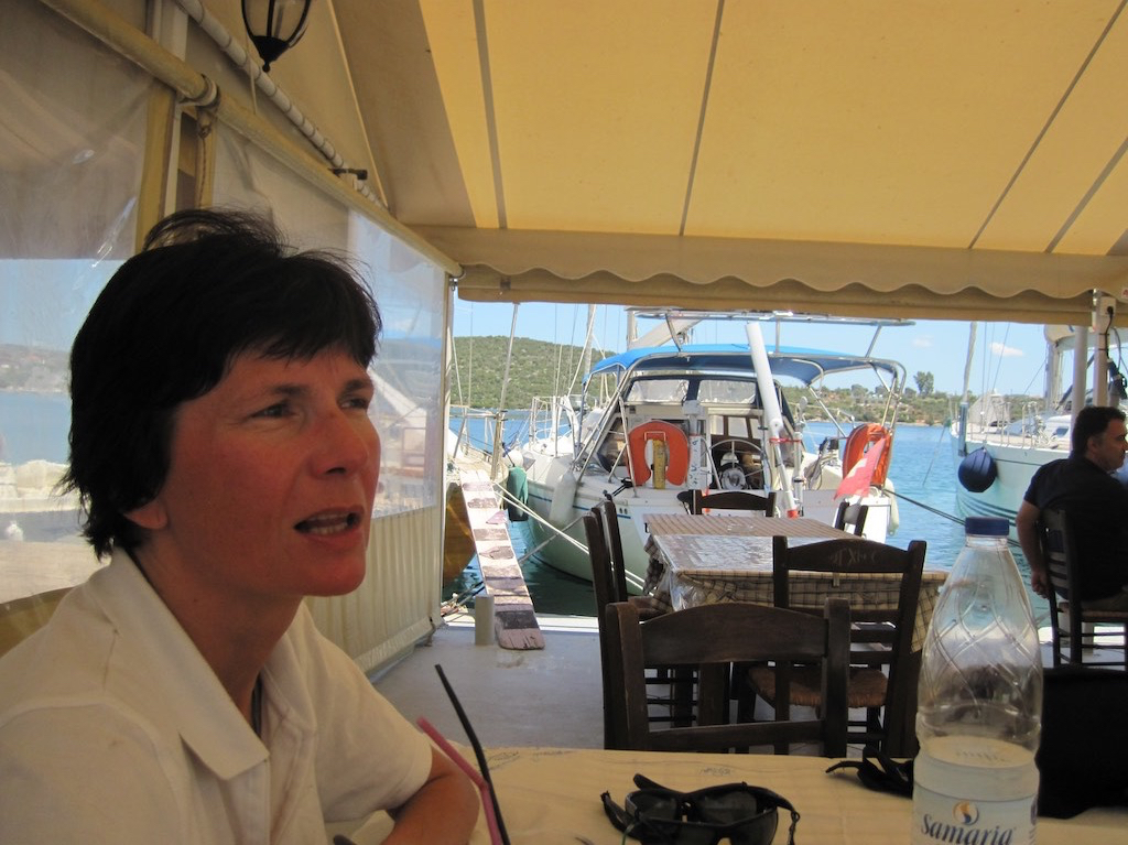 Nur noch fünfzehn Meilen uns Eck, dann sind wir in der wunderschönen Bucht von Korfos. Aber es zieht sich fast ewig, bis wir den kleinen Leuchtturm umrunden. Der Wirt wartet schon und hilft uns beim Anlegen. Müde, durstig und hungrig stürzen wir in die Taverne. Schön!