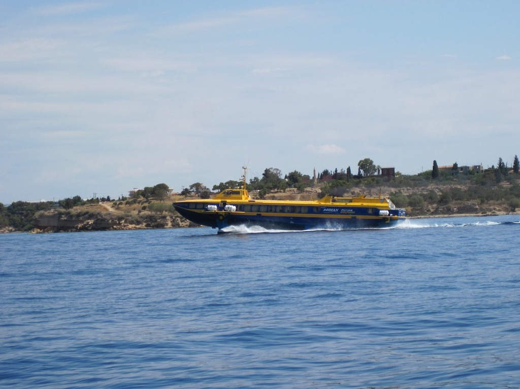 Und da vorne ist schon die Hafeneinfahrt. Von weitem haben wir schon einige Segler auslaufen sehen, also mit einem Platz an der Hauptstrasse sollte es also keine Probleme geben. Nur noch kurz ein Flying-Dolphin vorbei lassen und wir können einlaufen.