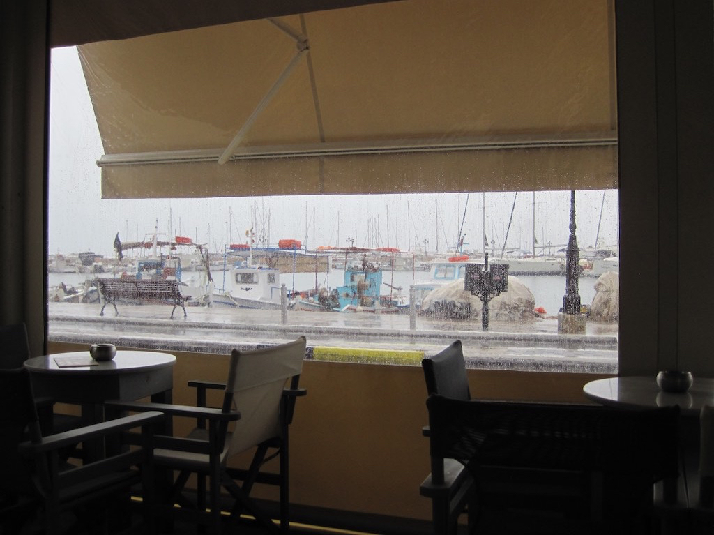 Gerade rechtzeitig haben wir unseren Spaziergang beendet und sind in einem Kaffee verschwunden. Der Eigner muss alle Wände runterlassen, weil es so schüttet und die vorbeifahrenden Auto die Pfützen leeren. Wir geniessen das Frappee und die Einheimischen freuen sich auf den ersten Regen seit drei Monaten.