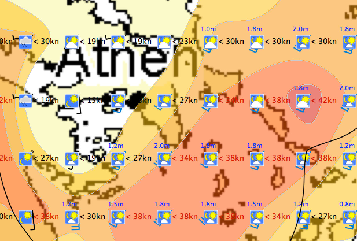 Wir sollten abhauen! Das Wetter soll über 34 kn Wind von Süden her nach Karystos bringen. Also, abwarten oder an einen sicheren Ort. Wir hatten das Wetter über die letzten Tage sehr genau angeschaut und waren zur Überzeugung gekommen, nichts wie weg. Der letzte Berichte bestätigt das auch.