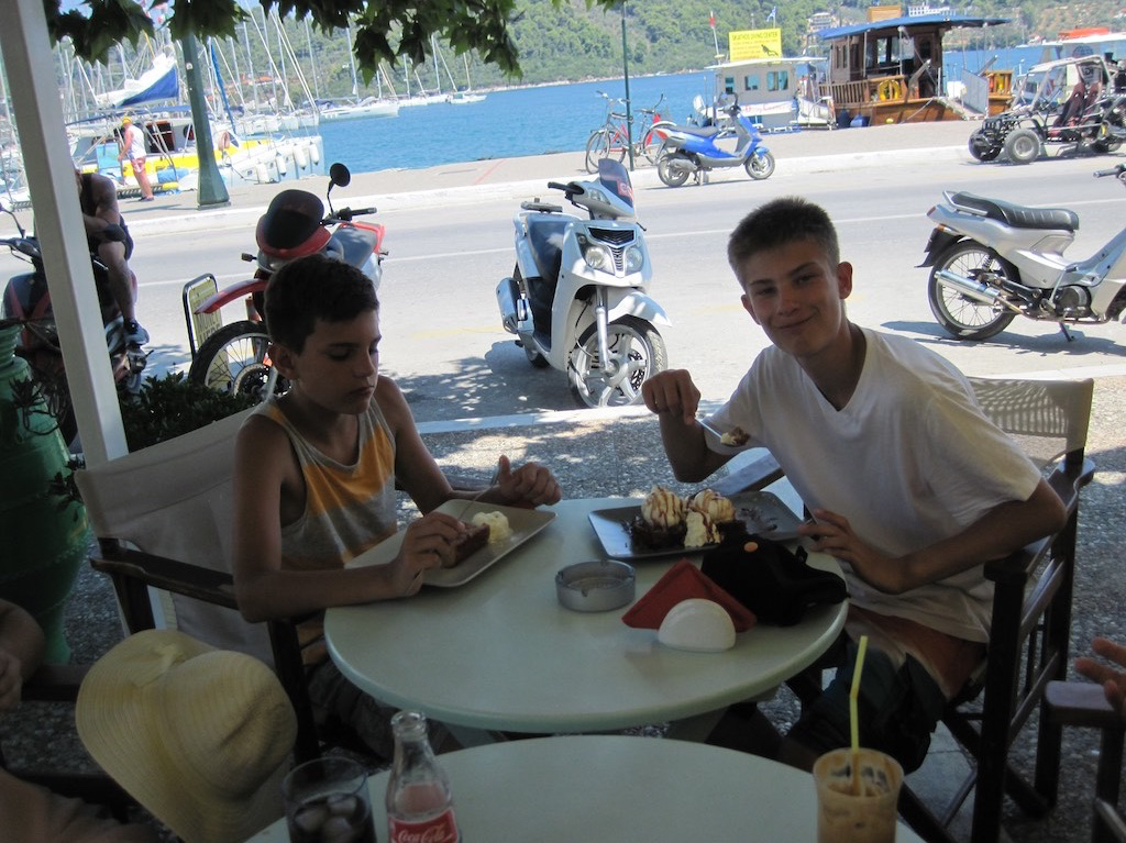 Einen Platz? Nur mit viel, viel Glück ergattern wir uns einen an der öffentlichen Mole. Ein Grösserer hatte nicht reingepasst und uns ihn überlassen. Heute ist Wechseltag und alles hoffnungslos verstopft. Aber auch unser Platz ist nicht die Wucht. Trotzdem wollen, müssen wir hier ein paar Tage aushalten, denn die Kids, Joel und Marco treffen erst am Sonntag ein. Jetzt aber ein Bier und für die Kids endlich was zu Essen. Nur ein kleiner Dessert nach dem Mittagessen 😉
