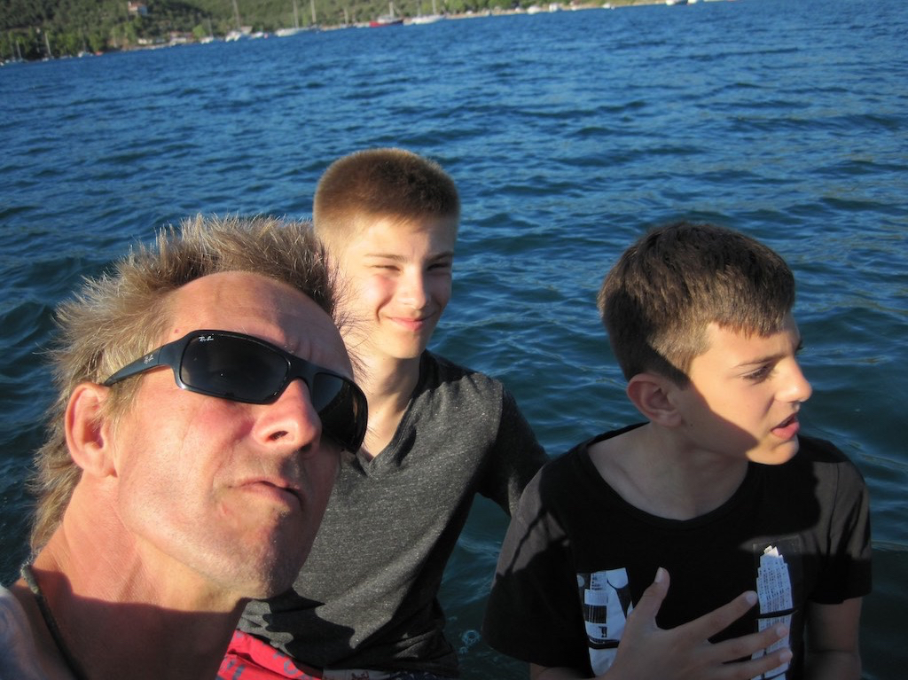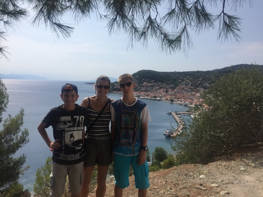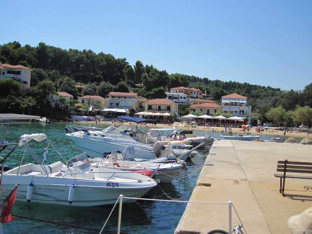 Was schon Mittwoch? Ja, wir müssen langsam in Richtung Skiathos. Am Samstag geht schon der Flieger und da wollen wir uns noch ein paar Orte anschauen. Heute ist Katigiorgis am östlichen Punk von Pilion an der Reihe. Mal schauen was es da zu sehen gibt. Wir sehen Skiathos schon sehr nahe, als wir in die kleine Bucht einbiegen. Platz? Platz hat es fast nicht. Hunderte von Schlauchbooten sind kreuz und quer angemacht. Wollen wir da bleiben? An einen idealen Platz dürfen wir nicht, da kommen noch Ausflugs- und Taxiboote. Also zwängen wir uns zwischen die Kleinen. Alles okay, als sich noch ein Italiener neben uns zwängt. Ohne Fender zu Glück. Das können wir fast nicht glauben! Auch mein Gerufe ignoriert er einfach und steigt in sein Auto. Alle Fender nach Links und abfendern. Als der Wind und der Schwell noch nach Süden drehen, ist die Suppe fast am kochen. Wir sind sicher, aber sein Nachbar bekommt immer wieder ein paar schrammen ab. Zeit für einen Spaziergang ins Dorf und an den Sandstrand. Die Kids sind schon lange da und vergnügen sich blendend.