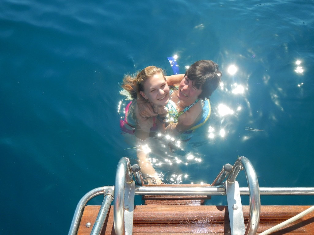Die Bucht Vothikelon lädt wahrlich zum Baden ein. Sogar Gaby wagt den Sprung ins kalte Nass! (26°)