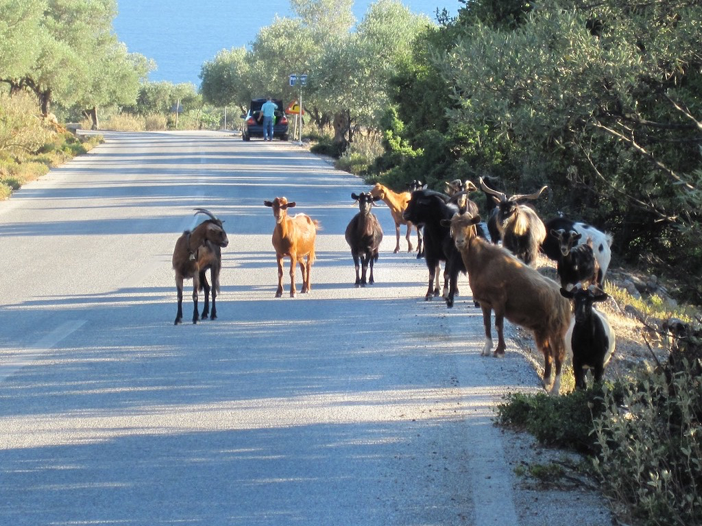 Nach einem erfrischenden Durstlöscher trennen uns die Wege. Gaby und ich laufen wieder der Strasse entlang und treffen auf eine Herde Geissen.