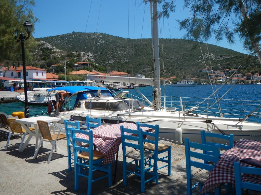 Die Ausflugschiffe kommen und gehen, aber es bleiben immer noch die Autofahrer übrig und es ist ein regelrechter Zoo. Eine überaus schöne Bucht und mit netten Beizen, aber definitiv zu viele Leute. Morgen muss es definitiv ruhiger werden. Südwind ist angesagt und so suchen wir dementsprechend eine Bucht aus. Unsere Auswahl fällt auf Tsoungria. Offen nach Norden und Super geschützt gegen den Schwell aus Süden.