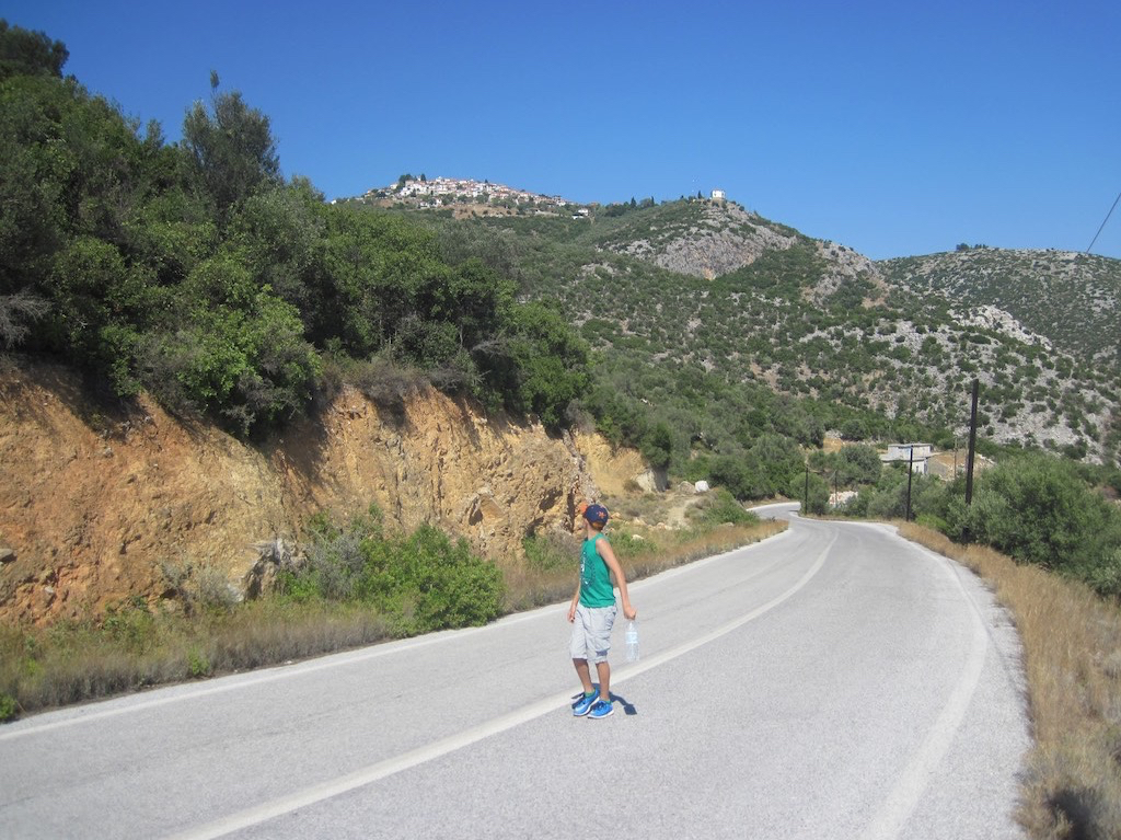 Am Ufer angekommen, gehts der Strasse entlang in Richtung Agios Andreas. Die Boys versuchen es mit dem Dingi und umfahren die nächste Bucht.