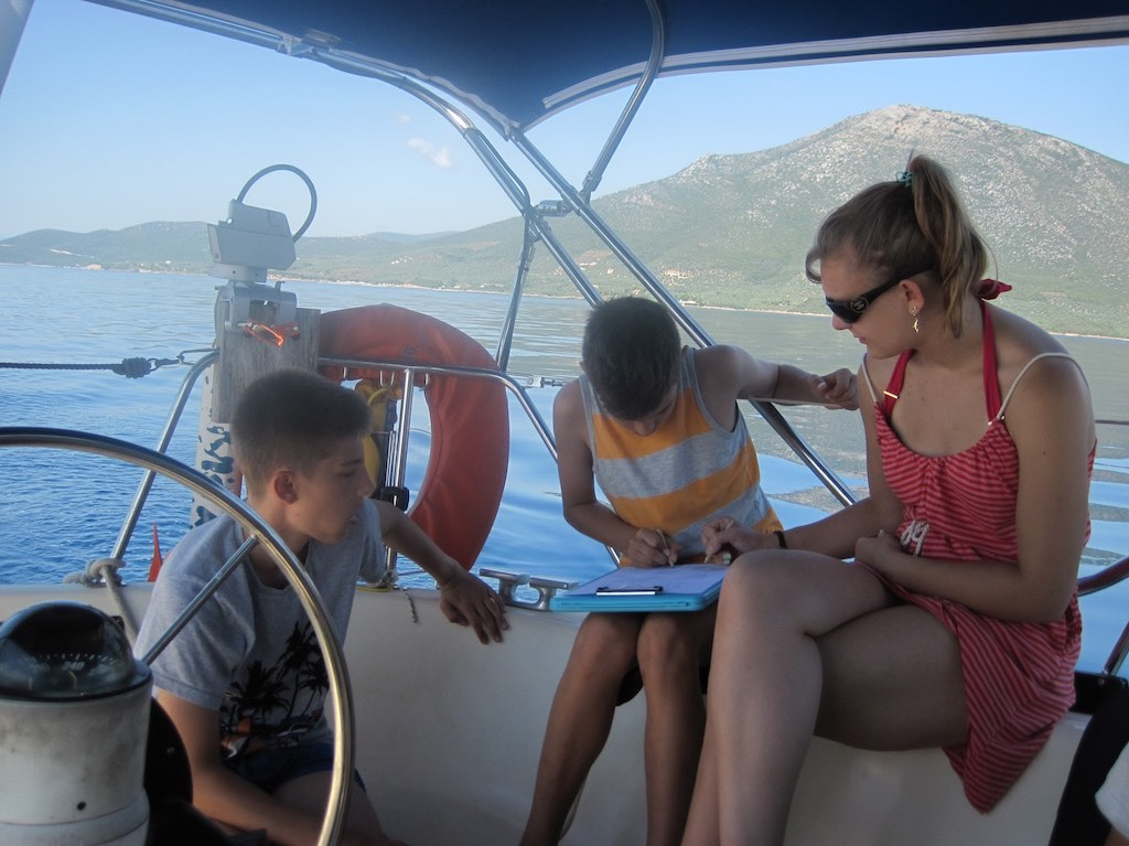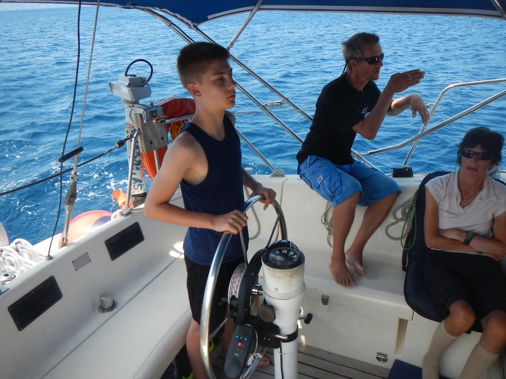 Ohne Wind verlassen wir nach einem Morgenbädu die Bucht und tuckern gegen Norden. Die Kids vergnügen sich bei einem Spiel.