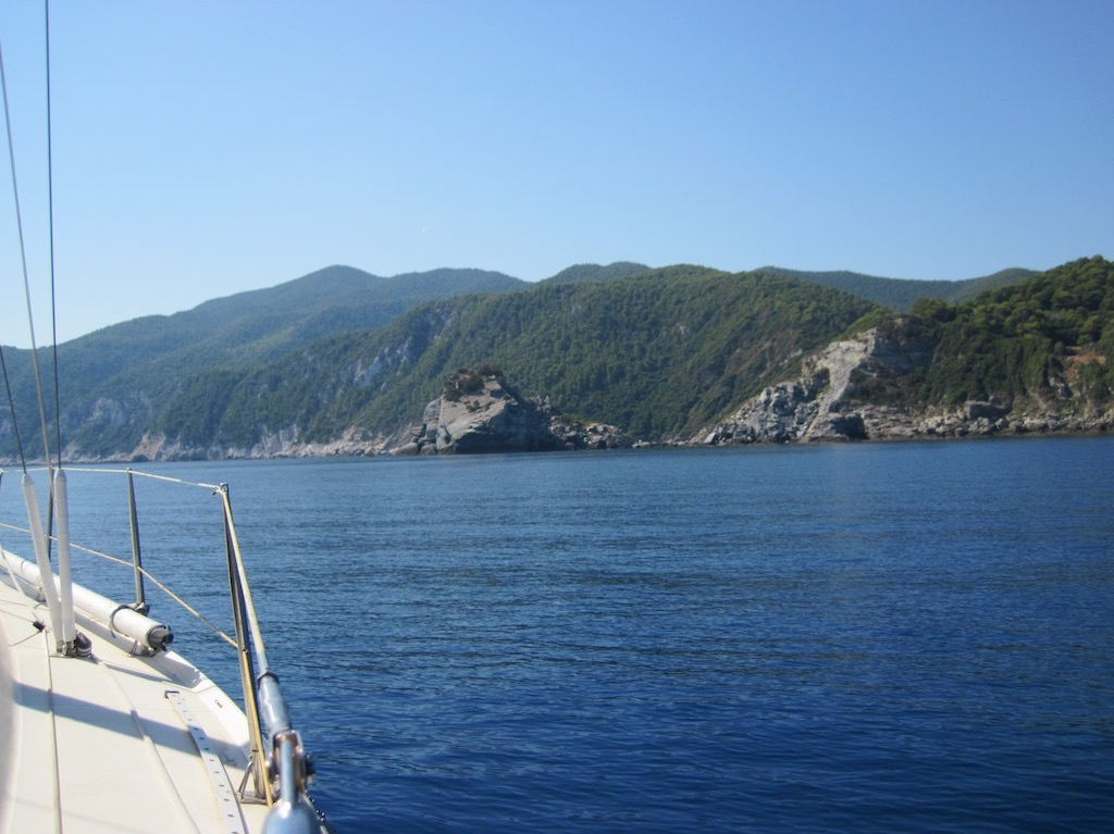 Segeln oder doch nicht. Fast. Der Wind hat zwar etwas zugenommen, aber die Abdeckung von Alonissos lässt den Wind wieder sterben. Das südlich Kap umrunden wir mit dem Motor und sehen bald Patitiri.