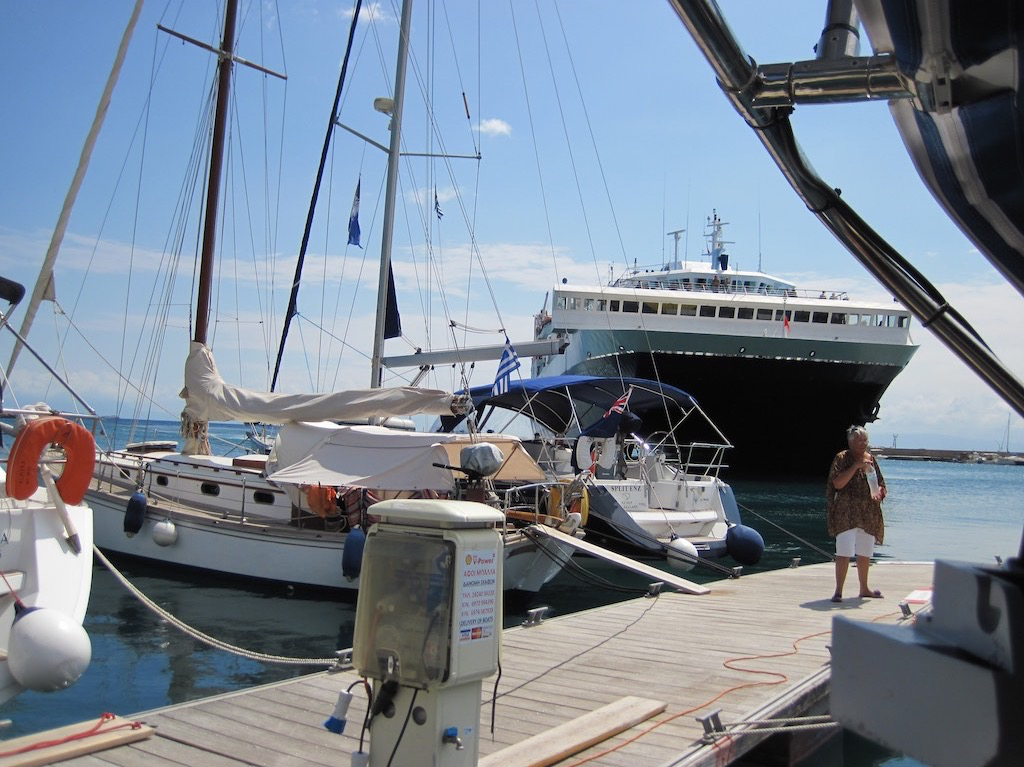 Der Schwimmsteg in Loutraki hat Heute genügend Platz und so legen wir mit Anker an. Dann werden wir plötzlich überfallen. Ein Grosser kommt in unsere Nähe.