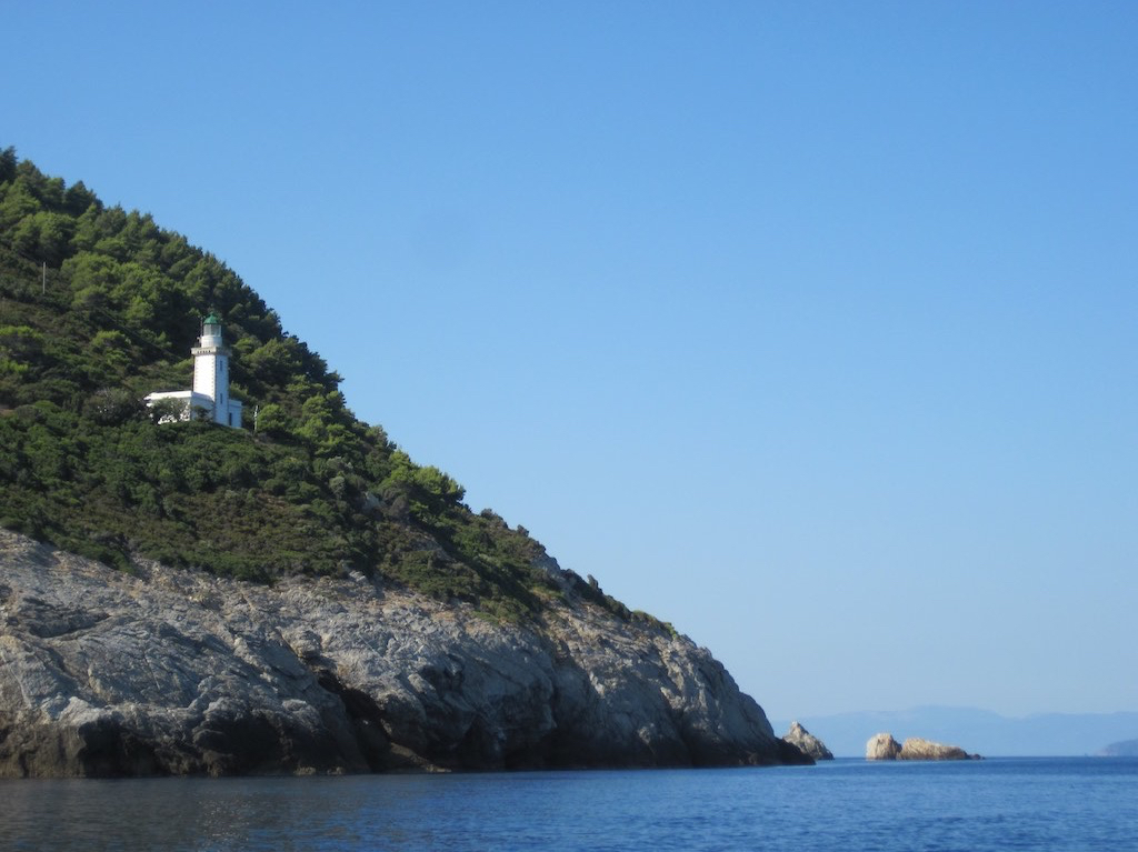 Etwas müde machen wir uns auf dem Weg nach Norden. Wir wollen bei dem ruhigen Wetter Skopelos im Norden umfahren, denn der Wind fehlt gänzlich. Da ist schon der Leuchtturm.