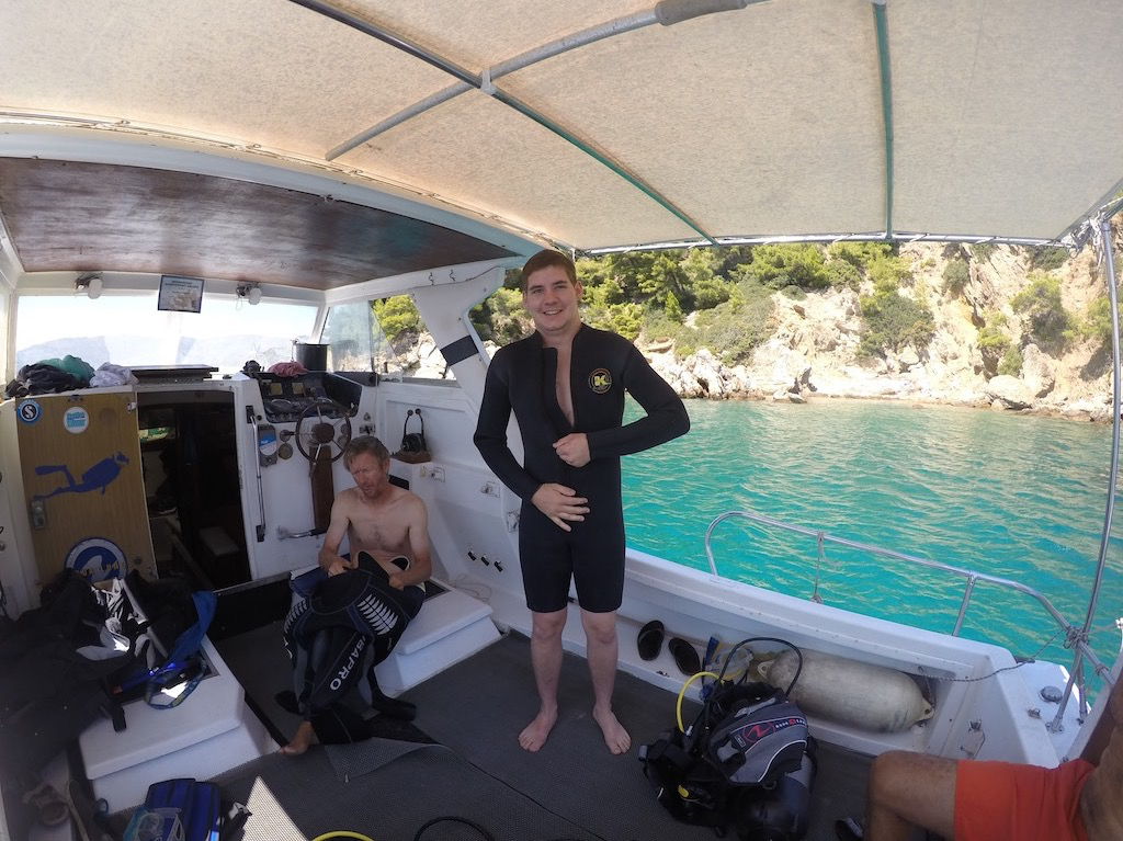 Danke ihr beiden! Jetzt sind wir wieder dicht und die Gangway rollt wieder. Es ist schon Dienstag, der Wind hat sich gelegt und so brechen wir mit unserem Divemaster zur Insel Arko auf. Alles bereit? Fast, der blöde Neopren.