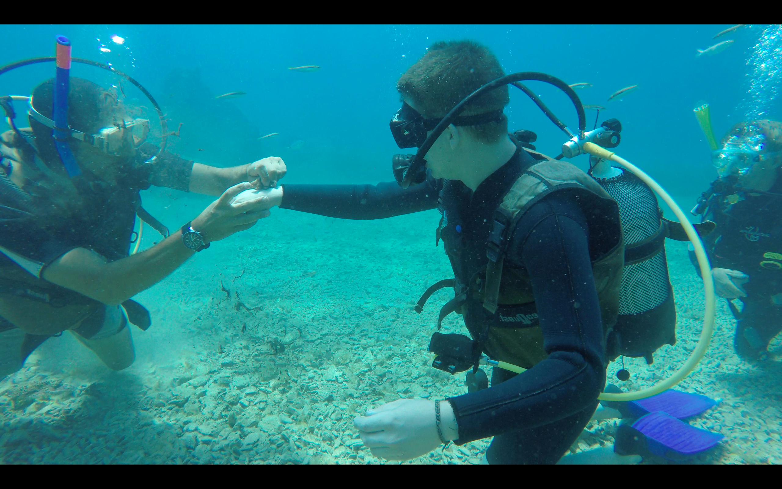 Marcos erster Tauchgang ist schon im vollen Gange. Die Übungen meistert er bravurös. Gut gemacht. So können wir alle zusammen die Unterwasserwelt erkunden. Da, da ist ein kleiner Tintenfisch. Kann man den streicheln? Ja. Marco versucht’s.