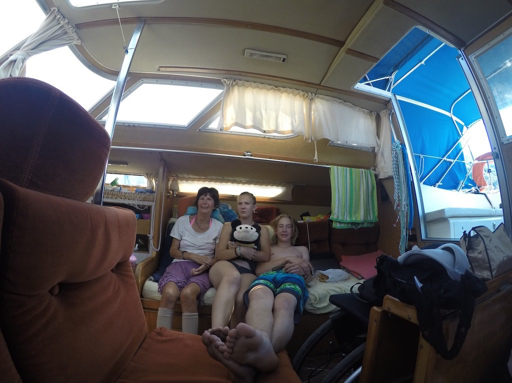 Alles auf dem Steg abgeladen und somit wird Gaby verladen, den Rollstuhl oben drauf und den Töff nicht vergessen. Jasmin, gehts mit den Beinen? Passt schon. Am Schluss nur noch ich oben drauf, schön in der Mitte und ja nicht wackeln.
