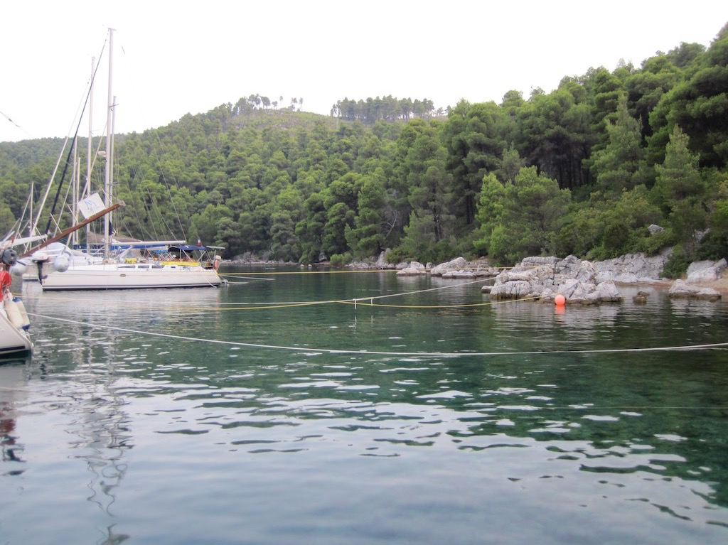 Die letzten paar Meilen bis zu unserem heutigen Ziel, werfen wir den Motor noch kurz an. Ormos Panormou wollen wir schon noch anschauen. Es sind schon viele Boot vor Anker, aber für unsere kleine Büx hat es fast immer noch einen Platz. Kampftaucher sind bereit und werden mit den langen Leinen abgesetzt. Anker runter und das Heck mit den an Steinen festgemacht Leinen befestigen. Etwas Seitenwind, kein Problem. Hunger und Pause vom vielen segeln.