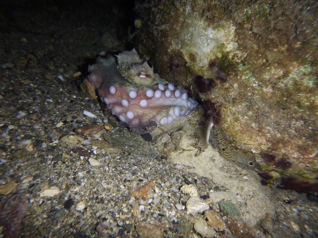 In der Nacht wollen die beiden Boys die Unterwasserwelt erkunden. Mit der Brille, Flossen, Kamera und der Taucherlampe gehts los. Schon beim ersten Versuch finden sie einen schüchternen Tintenfisch unter einem Stein, geradewegs unter unserem Boot.
