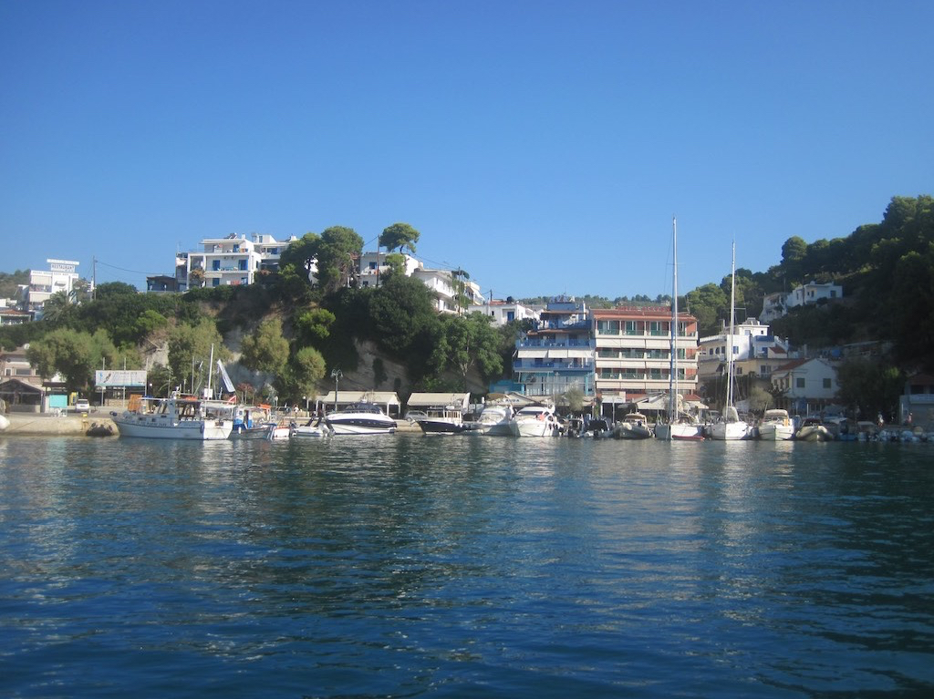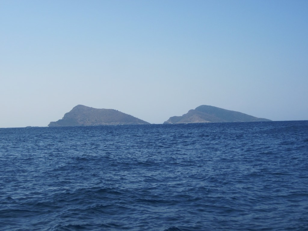 Aber kaum sind wir draussen, bläst es uns mit 6, 8, 12 Knoten um die Ohren. Natürlich genau auf die Nase. Ja, das kann in etwa sein. Nach einer halben Stunde, werden auch die Wellen immer höher. Hmm, also abdrehen nach Peristera, der Nachbarinsel von Alonnisos. In deren Wind- und Wellenschatten kommen wir Super voran und wagen uns schlussendlich sogar ums Ostende. Das Warten in der geschützten Bucht schlagen wir in den Wind. Wir können sogar die Aussicht auf die Twinbrothers geniessen.