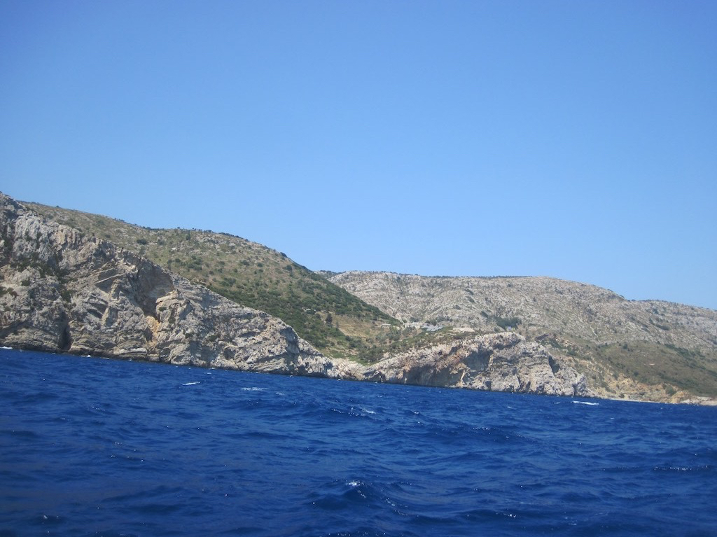 Aber kaum ums Eck, schiessen die Wellen in die Höhe. Wir kommen kaum mehr voran und stampfen uns fest. Da müssen 2200 U/min vom Motor verlangt werden und wir das Ding umrunden. Stampf, stampf. Ich Fluche ab unserer Blödheit. Aber da gibt es doch eine Bucht im Osten, dort warten wir dann aber sicher. Auf der Höhe der Bucht müssen wir aber einsehen, keinen Schutz für uns. Also weiter im Text. Wir gewöhnen uns dran und gurken weiter nach Norden. Alonnisos ist geschafft und schon sehen wir unsere Zielinsel Pelagonisi. Dort oben im Norden ist eine sehr geschützte Bucht die auf uns wartet. Endlich kommen wir in die Abdeckung der Insel und die Bewegungen im Schiff werden schlagartig bequemer. Dann die Ostküste hoch und am Kloster vorbei.