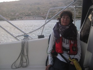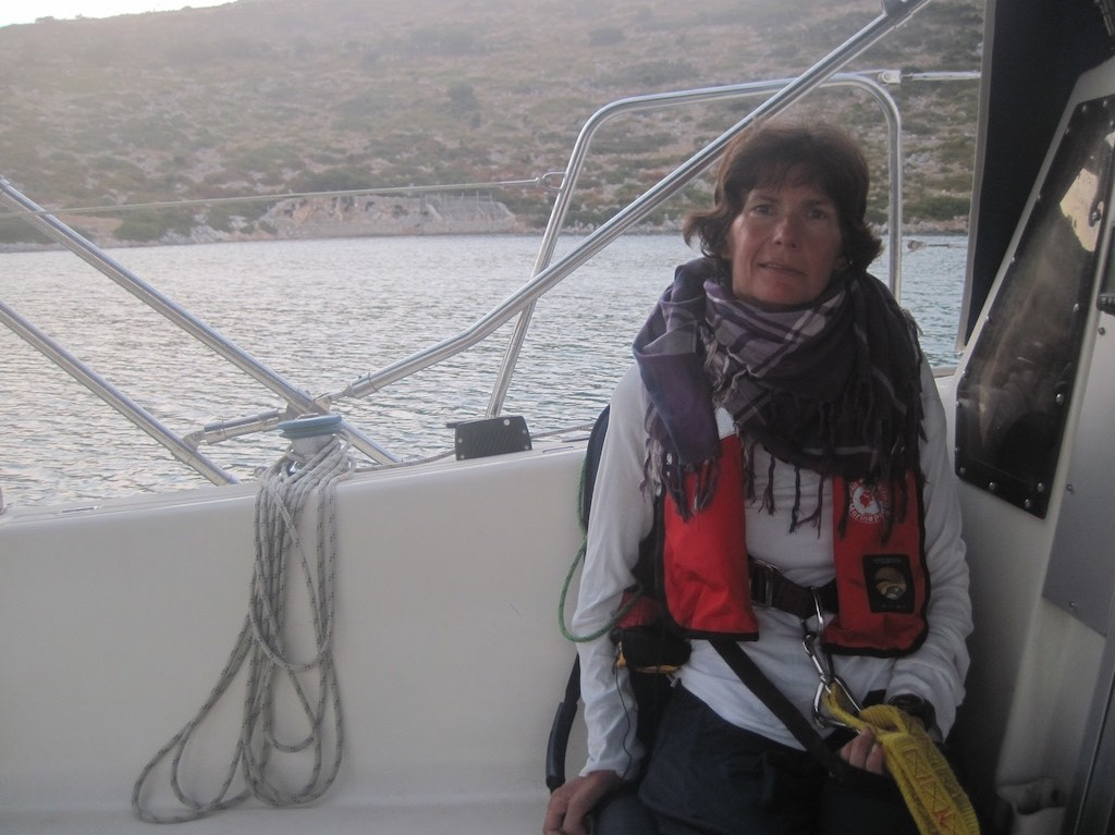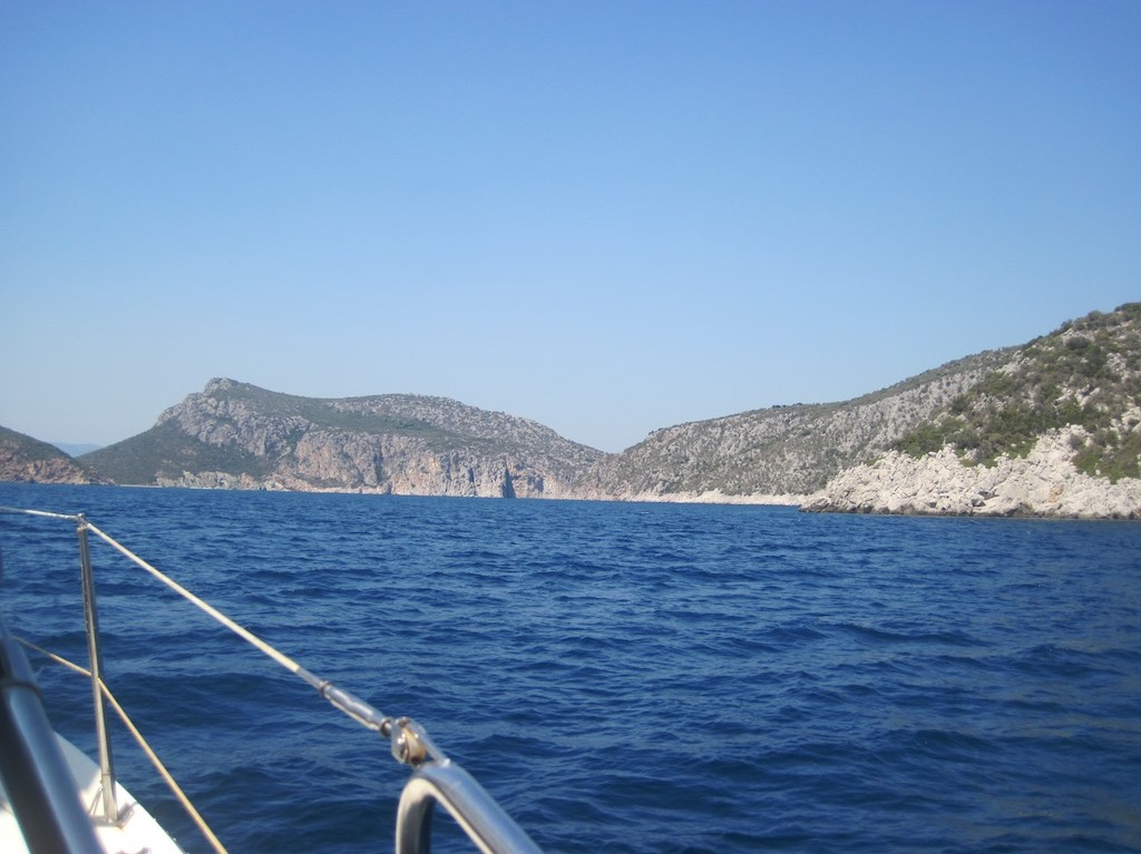 Auf einmal. Gaby mag nicht mehr! Die ewigen Wellen und das heftige eintauchen des Bugs machen ihr zu schaffen. Also runter ins flache, ruhige Bett. Prompt kommt eine Böe und wir knallen miteinander aufs Bett. Hmm, das tat weh. Mir wird sofort schlecht, lege aber Gaby noch richtig hin und renne nach draussen. Dort hat sich der Wind gedreht und etwas abgeschwächt. Kurs korrigieren und alles Tuch raus. Fertig. So machen wir wieder zügig Fahrt zum Festland. Wie gehts Gaby? Runter, schauen. Sie hat sich ein Becken geschnappt und sich übergeben. Ich will raus, so geht das nicht. Ist doch ganz Ruhig hier? Nein, nein, ich brauche Luft. Also wieder nach draussen betten. Die Wellen und der Wind nimmt weiter ab und so surfen wir nicht mehr so heftig. Den grossen Fels von der Südspitze von Sithonia, also dem Mittelfinger von der Halbinsel Chalkidikis kommt immer näher. Gleich da hinten ist die grosse, geschützte Bucht von Koufos. Aber wo ist die Einfahrt?