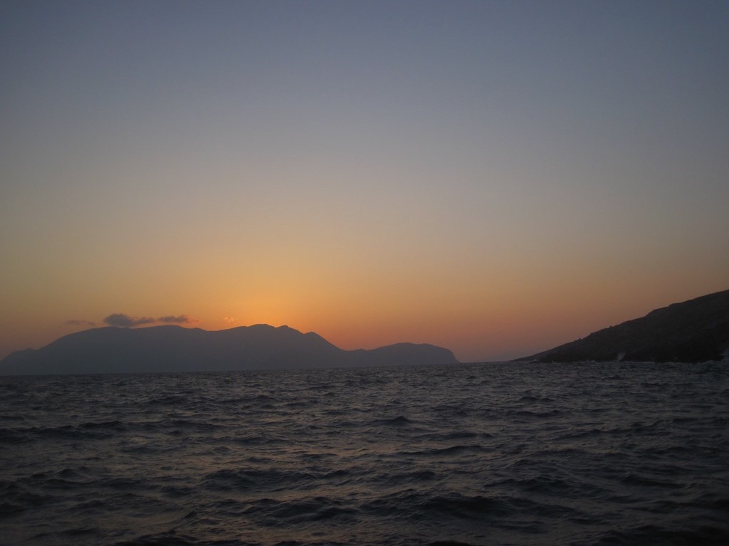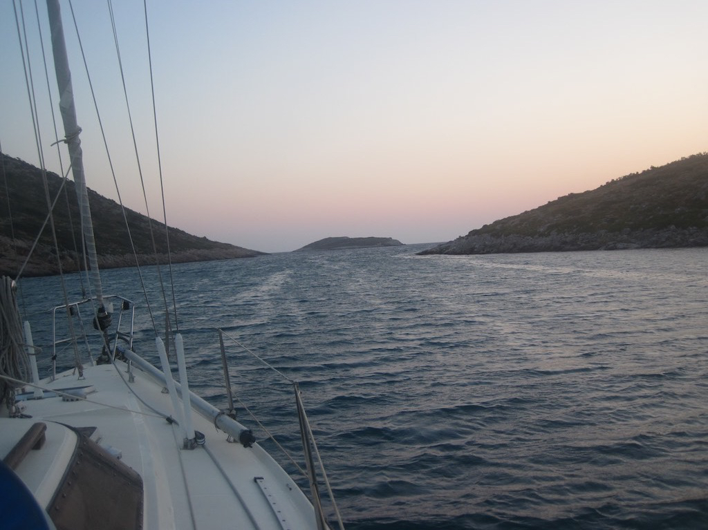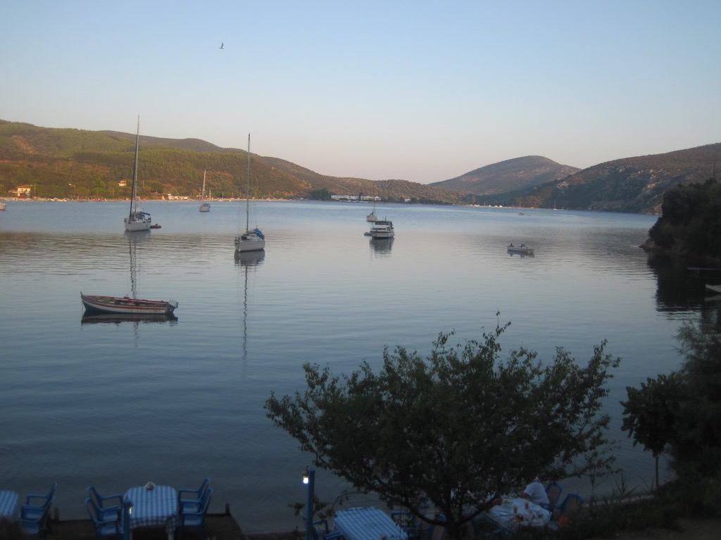 Rein in die Ruhe und einen schönen Platz suchen. Ist aber gar nicht so einfach. Viel zu tief und da wo es geht, werden wir wieder verscheucht. Also Anker bei zwanzig Meter. Nicht so gut, aber es geht einfach nicht anders und wir sind viel zu Müde um noch weiter zu segeln. Das Wetter ist regelrecht zahm. So geht das schon in Ordnung. Kaum sind wir richtig fest, den WC-Termin hinter uns und haben etwas keines gegessen und vor allem getrunken, kommt Gaby: Ich will ans Land in eine Taverne. Wir haben es uns doch verdient. Ich schaue sie nur mit grossen Augen an. Ich muss überlegen … also gut, wir gehen an Land. Dingi raus, aufblasen, Paddel montieren und Motor anschrauben. Fertig. Es ist soooo heiss, ich notiere bei der Ankunft 34.3°, es laufen mir nur so die Bäche runter. Wir warten noch bis die Sonne fast verschwunden ist und machen uns auf den Weg. Diesmal ohne nassen Unterboden, ohne blaue Flecken und schön gediegen legen wir den Weg bis ans Ufer zurück. Warum nicht immer so. Etwas untief, aber da geht’s gut. Raus in den Stuhl und bald sitzen wir in einer nahen Beiz und das kühle Bier verdampft fast. Wir feiern. Dazu einen feinen Fisch mit der Aussicht auf die wirklich schöne Bucht.