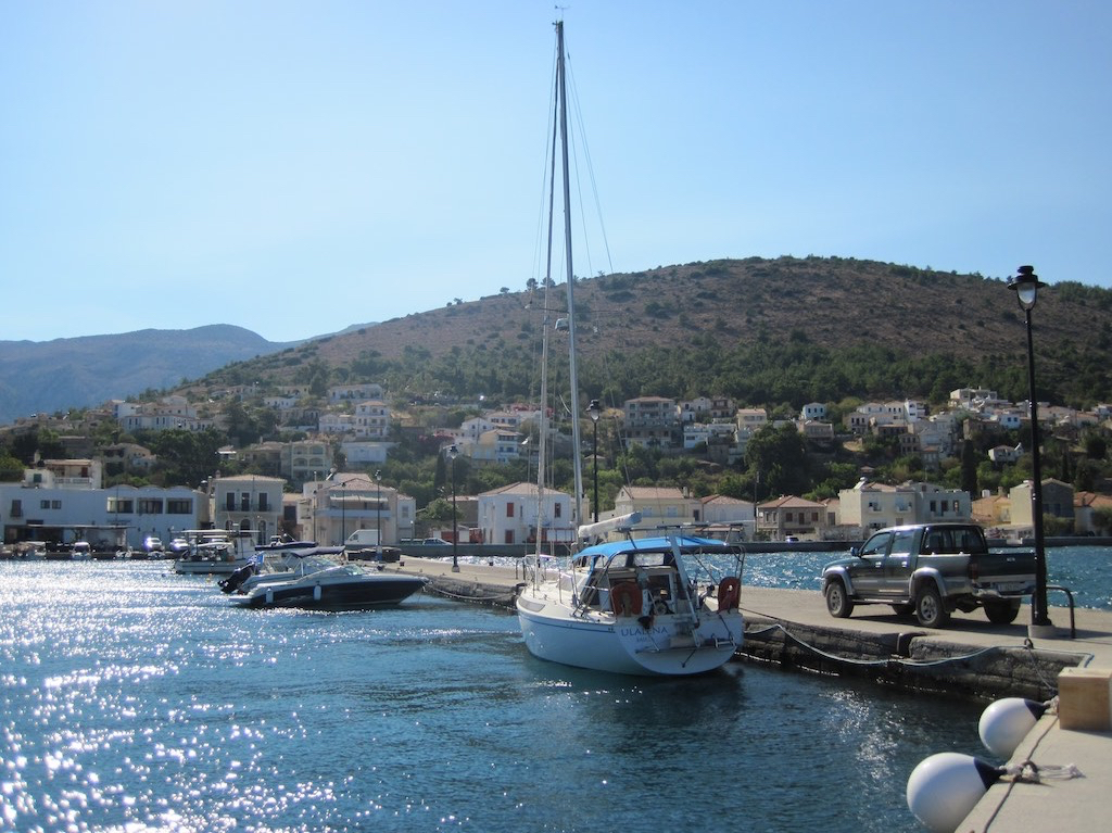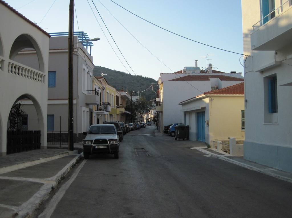 Der Wind nimmt noch immer zu und fast zwanzig Knoten messen wir jetzt. Sind wir hier richtig? Die Wellen überfluten schon fast die Mole. Nur eine Nacht und wir sitzen ja wirklich gut. Auf der anderen Seite spazieren wir durchs Dorf, also genaugenommen sind es deren Zweie. Marmaro und Kardamila. Eine lange Strasse verbindet sie.