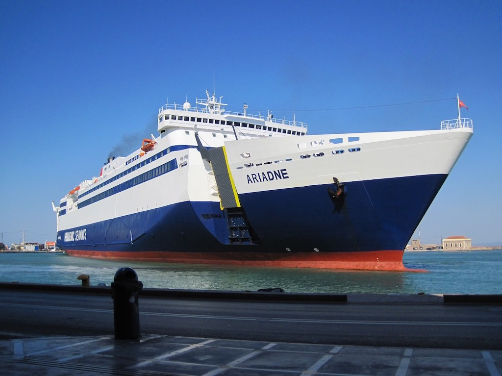 Wir setzen uns auf eine Treppe und schauen der grossen Fähre zu. Was macht die den da?