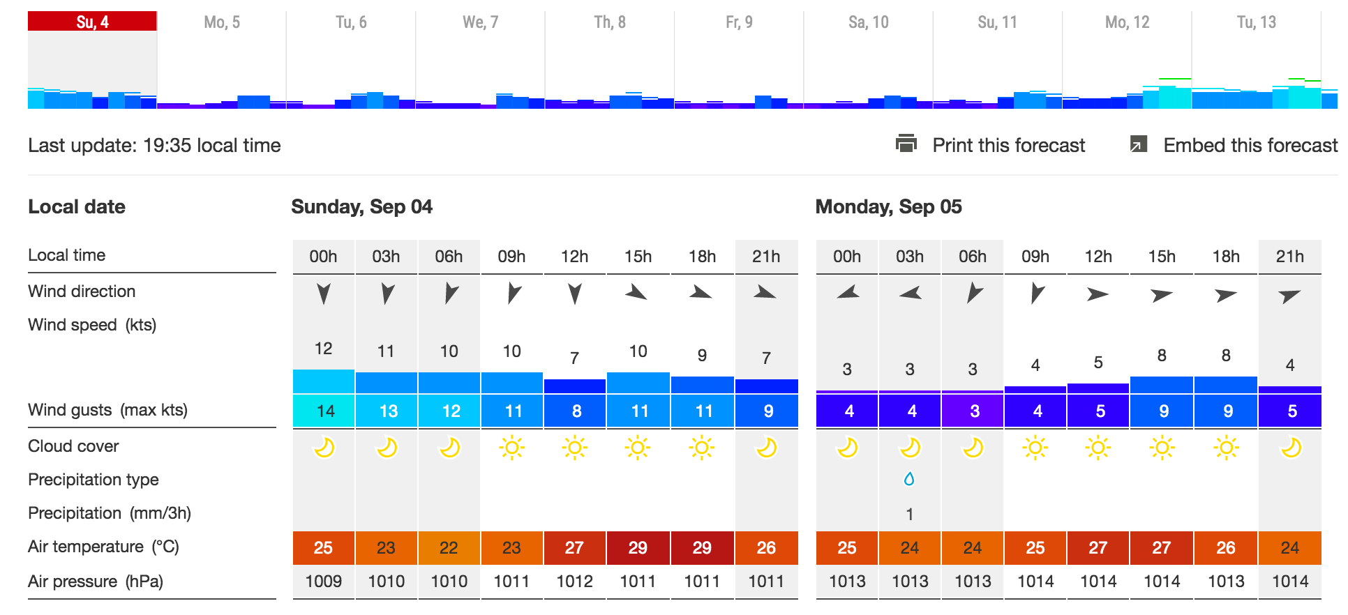 Mit den Startzeiten und Daten spielen wir so lang bis es uns beiden passt. Etwas Wind und nicht zu hohe Wellen soll’s in etwa sein. Was haben wir den?