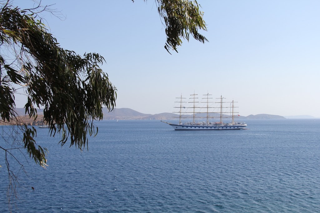 Wir mach uns auf, auf einen Spaziergang an eine der südlichen Bucht von Patmos. Grikou soll ein wunderschönen Platz sein. Quer durch den Hafen geht’s der Strassen entlang südwärts. Wow, und es werden noch mehr Touris an Land geschwemmt. Das schöne Schiff schwemmt seine Gäste an Land.
