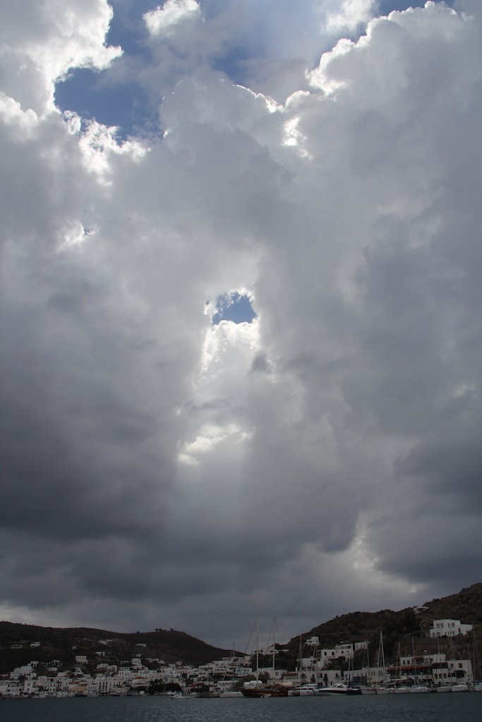 Können wir Morgen weiter? Jein! Es kommt eine doppelte Front auf uns zu. In den Peloponnesen waren es heftige Gewitter. Wir warten und suchen uns noch ein paar schöne Spaziegange aus. Die Front ist dann zum Glück nicht so gewaltig. Nur ein kurzer Schauer in der Nacht, das ist alles. Seit Mitte Juli das erste Mal wieder etwas Wasser von oben. Die Wolken, wir haben sie schon fast vermisst, sehen gewaltig aus.