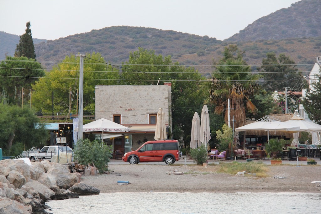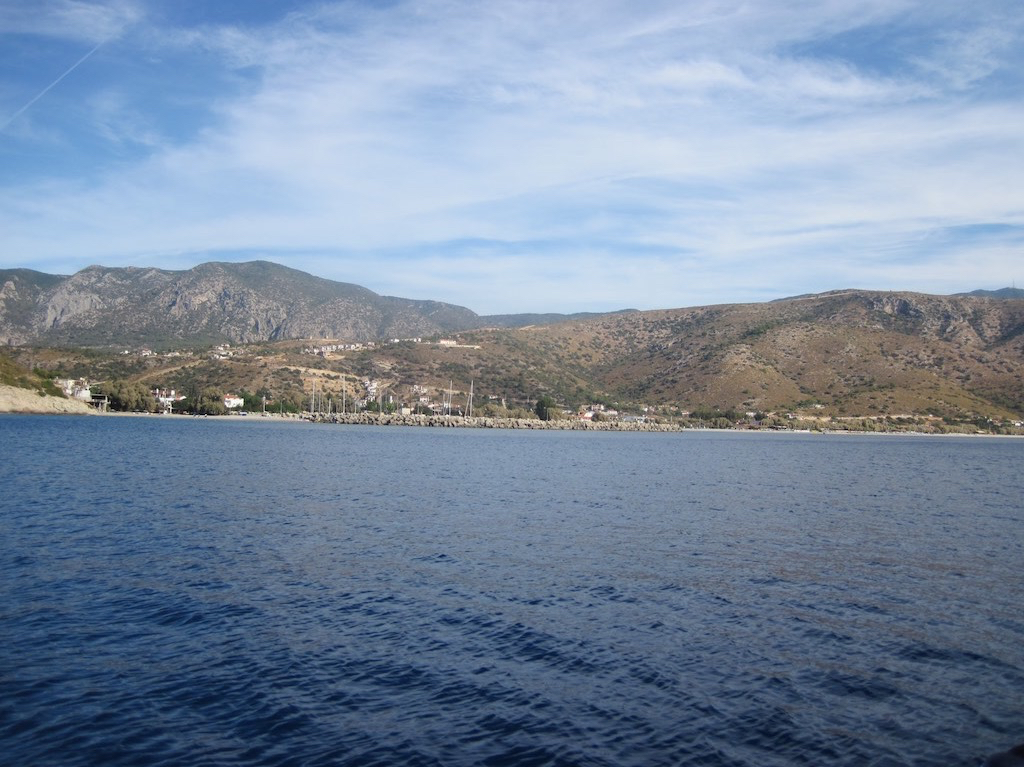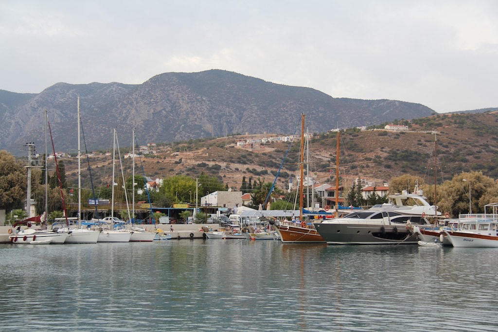 Etwas Wind vom Norden, reicht aber nicht für die Segel. Wir tuckern also gegen Osten, als beim nächsten Kap plötzlich der Wind oder besser die Böen anspringen. Wow, ist das cool. Ohne Wellen und mit bis zu 18 Knoten Wind segeln wir dem Badeort Palamut entgegen. Dann das nächste Kap und hoch zum eigentlich ersten Ort in der Türkei. Fertig, einfach so stellt den Wind ab. Wir dachten schon, das könnte heikel für die Einfahrt werden. Null Wind und plötzlich sehr warm. Gaby entledigt sich uhrplötzlich von den vielen Pullovern, Jacken und Schals. Da vorne, ist schon die Mole.