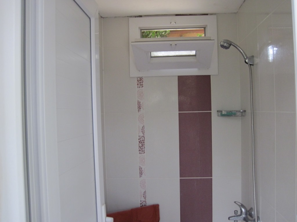 Von hier kommen also jeden Morgen um sechs die Gebete. Dann ist ja Heute noch Waschtag. Alles in den Sack und ab zu Dusche. Gaby kann’s kaum erwarten. Draussen, also hinten im Garten ist die Dusche eingerichtet.