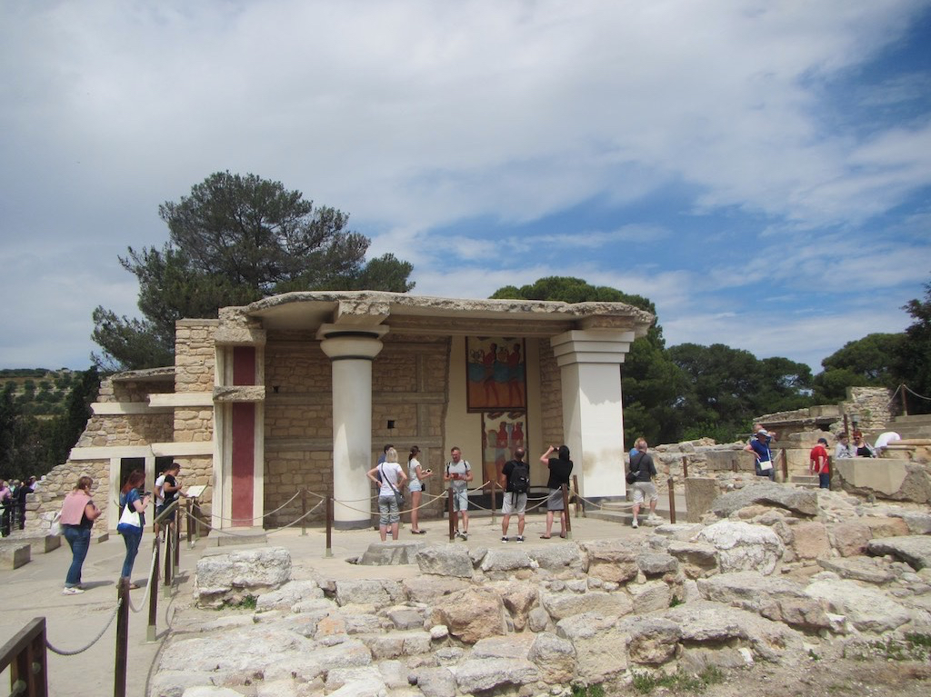 Morgen, morgen fahren wir nach Iraklion zu den Ausgrabungen der Minoer. Knossos muss man gesehen haben. Nach dem Ausschlafen, wow sind wir spät dran, fahren wir auf der Autobahn zur Hauptstadt. Die Ausfahrt kann man fast nicht verpassen und der grosse, grosse Parkplatz ist immer noch fast leer. Alle dachten wohl, es regnet auch Heute. Aber nein, schönstes Wetter ist es geworden. Beim Eingang wollen wir eigentlich nur pro forma ein Gratisticket holen. Zwei mal im Jahr ist “Tag des Museum”, Heute ist einer davon. Für alle Gratis. So, so. Dann investieren wir das Geld doch gleich in eine Führung. Rita, ja Rita bietet sich sofort an. Erkennt, das wir eine deutsche Führung brauchen und gibt uns gleich einen Rabatt. Gaby, ja Gaby will sie das Ganze ganz genau erklären. Einfach nur gewaltig, was wir über dieses mysteriöse Volk vor über 4000 Jahren erfahren. Sie hatten sogar schon damals Handelsbeziehungen mit dem alten Ägypten.