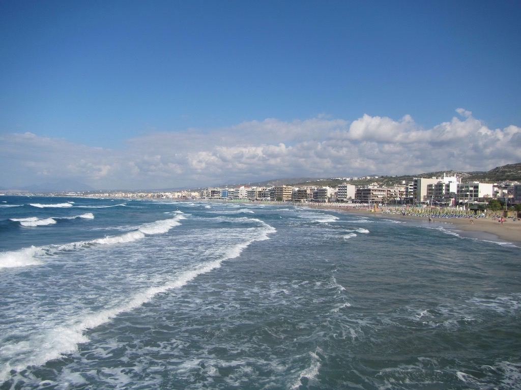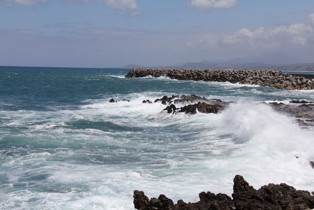 Um viertel vor vier hat das Schaukeln endlich ein Ende. Als wir den Wind ideal hatten, wurde er schwächer und schwächer. Schade. Aber wir sind in Rethymnon angekommen. Rund um die grosse Mole und in die Marina. Platz? Überall. Mooringleinen? Vermutlich. Aber da hat es längs an der Innenmole einen hübschen Platz für uns. Fender einstellen und schon liegen wir seelenruhig am “Geländer”. Fantastisch! Und weg ist der Frust vom ewigen Geschaukel. Essen? Nur kurz. Wir wollen an Land uns bewegen. Auf der anderen Seite sehen wir, warum dieses Geschaukel kein Ende nehmen wollte. Brandung!