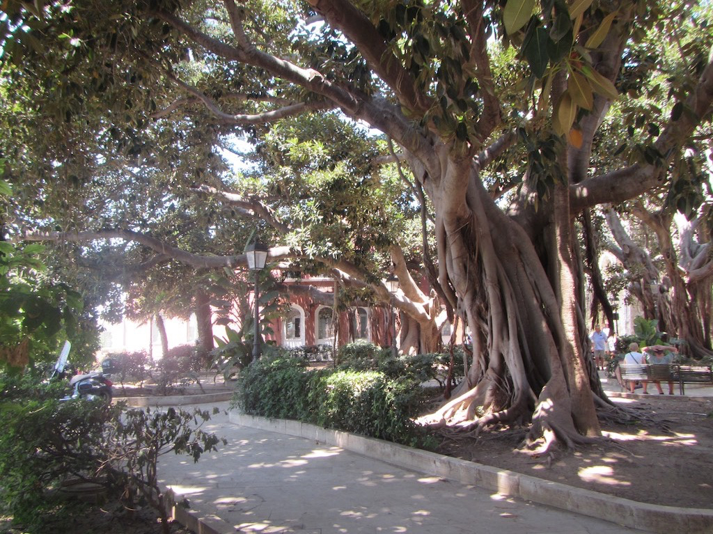 Am nächsten Morgen sieht wieder alles anders aus. Der Fehler, der Plusleiter am Solarlader war einfach ab und beim Nachbar erhalten wir den dringend benötigten Strom. Volle Kanne, mit 99 Ampere jagt der Lader fast die Batterien in die Luft. Den Kühlschrank räumen wir auch noch kurz auf. Alles wegschmeissen, ausser dem Bier ist das Verderbliche schon fast etwas gräulich. Dann ab auf den Markt und neue Sachen einkaufen. Mega feinen Pistazienkäse, Mozzarella und ein feines Brot. Dazu viel Früchte und Gemüse. Da lacht das Herz wieder! Zurück zur Ulalena und den wieder kühlen Schrank einfüllen. Nach einer kurzen Pause, nehmen wir die Erkundung dieser wunderschönen Stadt wieder in Angriff. Rundum wollen wir Heute und durchstreifen den Park kurz vor dem Brunnen. Die Bäume sind schon einmalig.