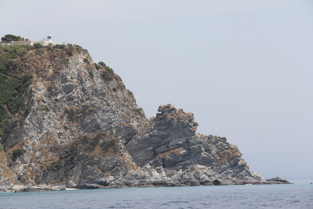 So motoren wir windlos gegen das Kap Vaticano am Festland entgegen. Dabei kommen uns tatsächlich die berühmten Fischerboote entgegen. Diese Schwertfischer haben da oben einen etwas besseren Überblick, wo die grossen Fische gerade durchschwimmen. Sieht ja ur komisch aus.