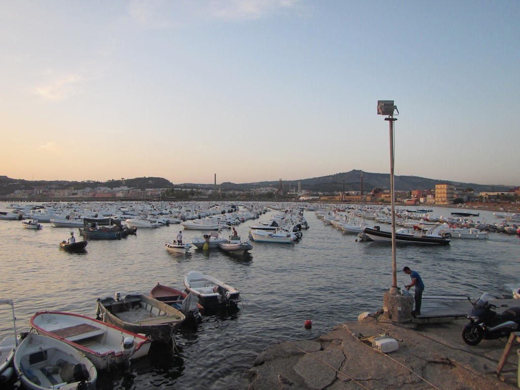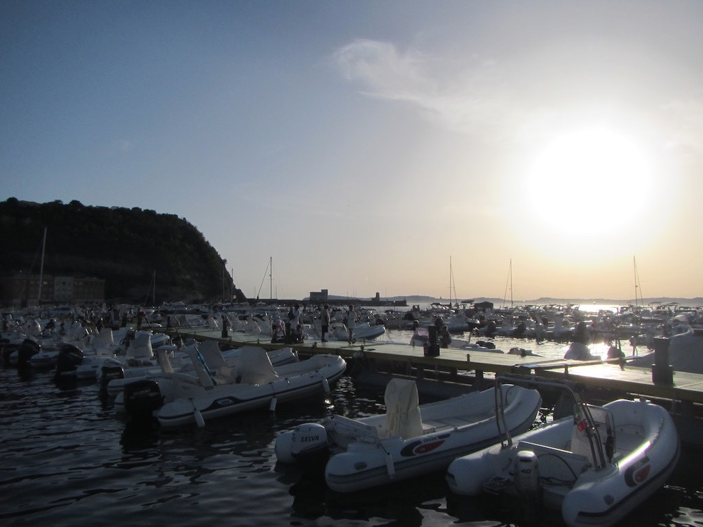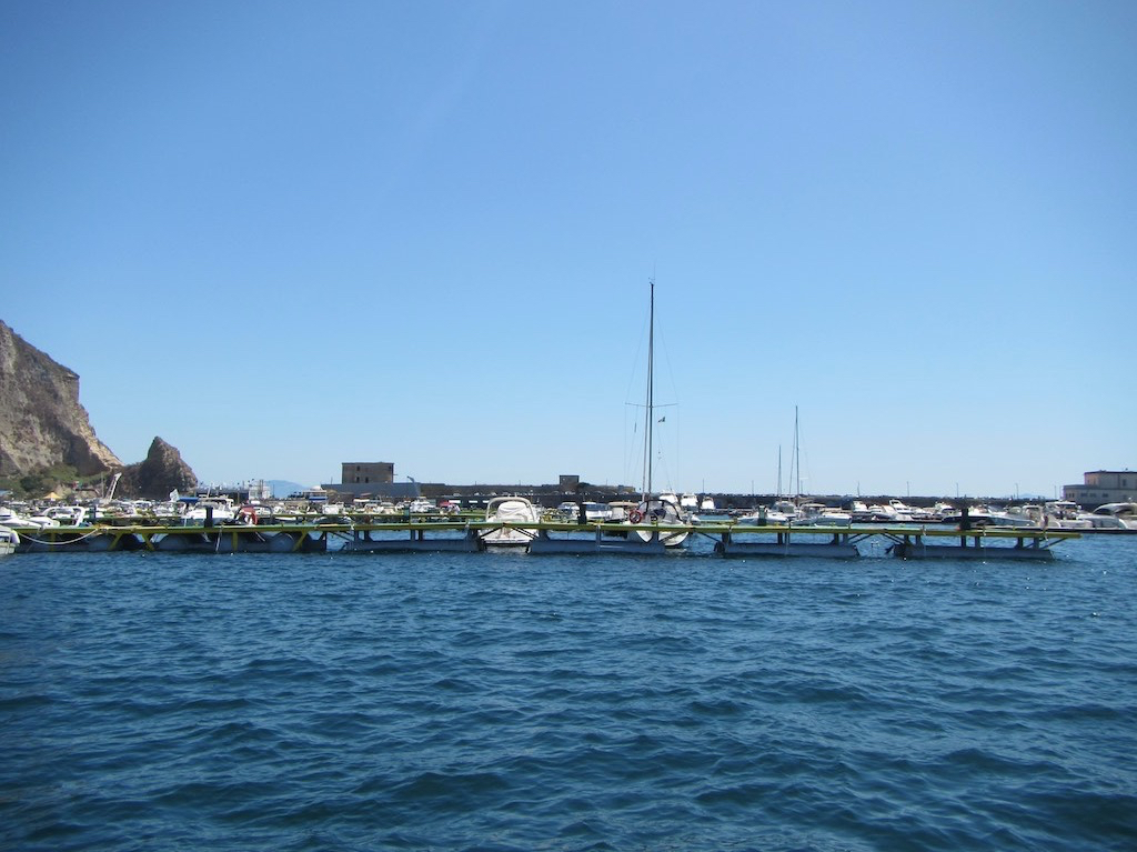 Wir fragen am Steg nach und werden zu einem Platz zugewiesen. Weit draussen. Weiter innen hat es leider keinen Platz. Was, ist doch alles leer? Sie wollen schauen was zu machen ist. Okay. Wir legen an und schon springt ein Marinerio aufs Boot und macht die Mooringleine fest. Das ist Service! Auch die Heckleinen werden professionell fixiert. Der wackelige Steg springt fast von den hohen Wellen. Wie kommen wir da nur runter? Zuerst sind wir aber mega froh, das wir endlich in Neapel gelandet sind. Kurz etwas Essen und dann an die Arbeit. Umbauen für fünf statt uns zwei. Die Bugkoje wird ganz geleert und der Salon aufgetürmt. Staubsaugen, Badezimmer und Küche putzen. Fertig. Ein Bier habe ich jetzt verdient. Wir wollen an Land. Die Marinerios bringen eine zweite Gangway und helfen uns auf den Steg. Gaby sicher im Stuhl, holpern wir dem Office entgegen. Der Chef war ja schon mal bei uns. Wir klären den Preis. Statt € 80.- bezahlen wir nur deren € 50.- pro Nacht. Danke vielmal! Gaby schmunzelt nur, als wir im klimatisierten Büro sitzen. Kurz noch das Abendessen klären, wir reservieren im Lazzaretto und dann sehen wir erst die ganze Menge Dingis. Endlos!