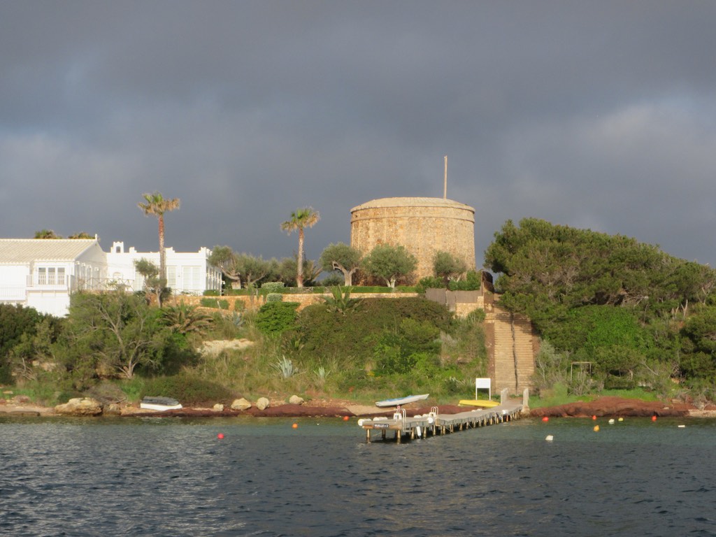 Eindrückliches Ding! Mit sechs bis fast sieben Knoten zieht das Ding. Gaby hat den Plausch. Sind denn die Wellen nicht etwas zu hoch? Frage ich, was für Wellen. Okay. Der Wind dreht und kurz vor dem Punta des Morter sehen wir den Eingang in die grosse Bucht von Fornells. Den Turm, ja, das müsste wohl richtig sein.
