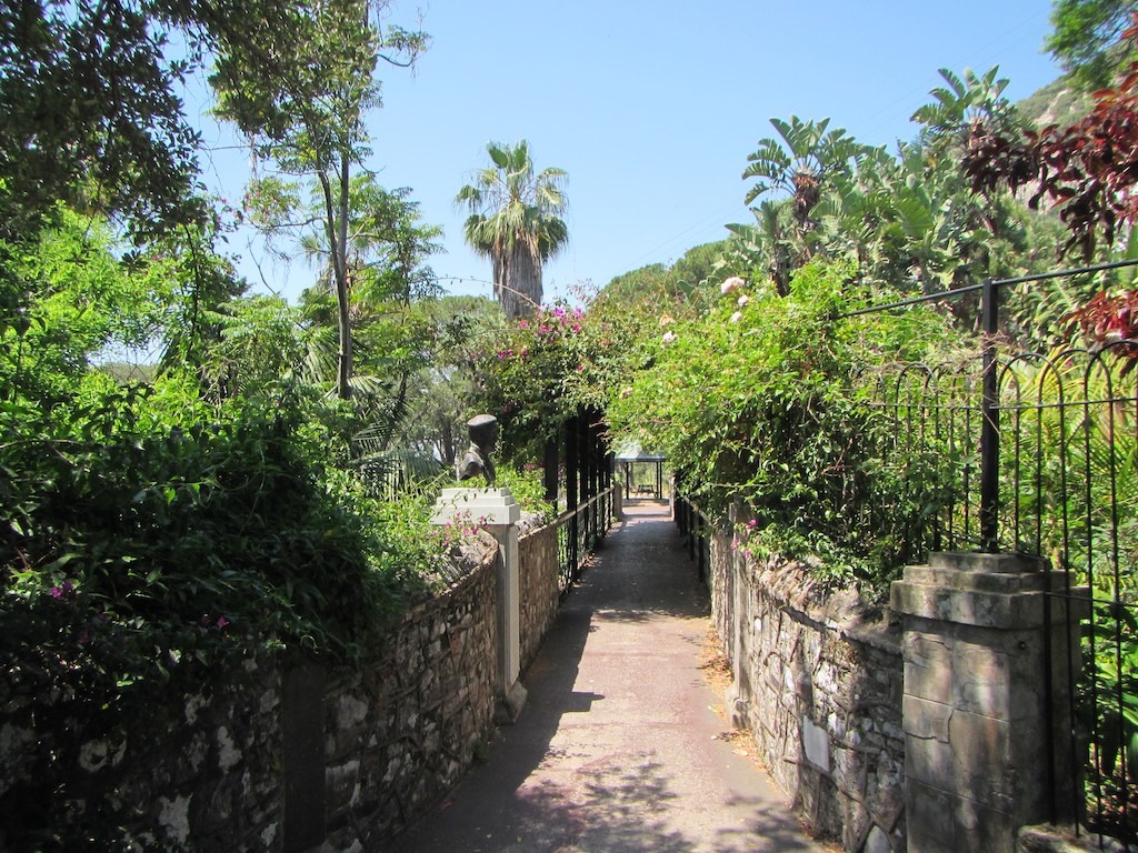 … zum Garten. Eingang, Treppen. Also aussenrum. Schön hier, wo gehts weiter, natürlich über Treppen. Gaby stelle ich kurz in den Schatten und schaue zuerst nach. Da müssen wir hoch, ist mein Fazit und so holpert sie schon die ersten Stufen hoch. Die Brücke, der Garten – wunderschön. Etwas Unterhalt braucht er aber dringest.