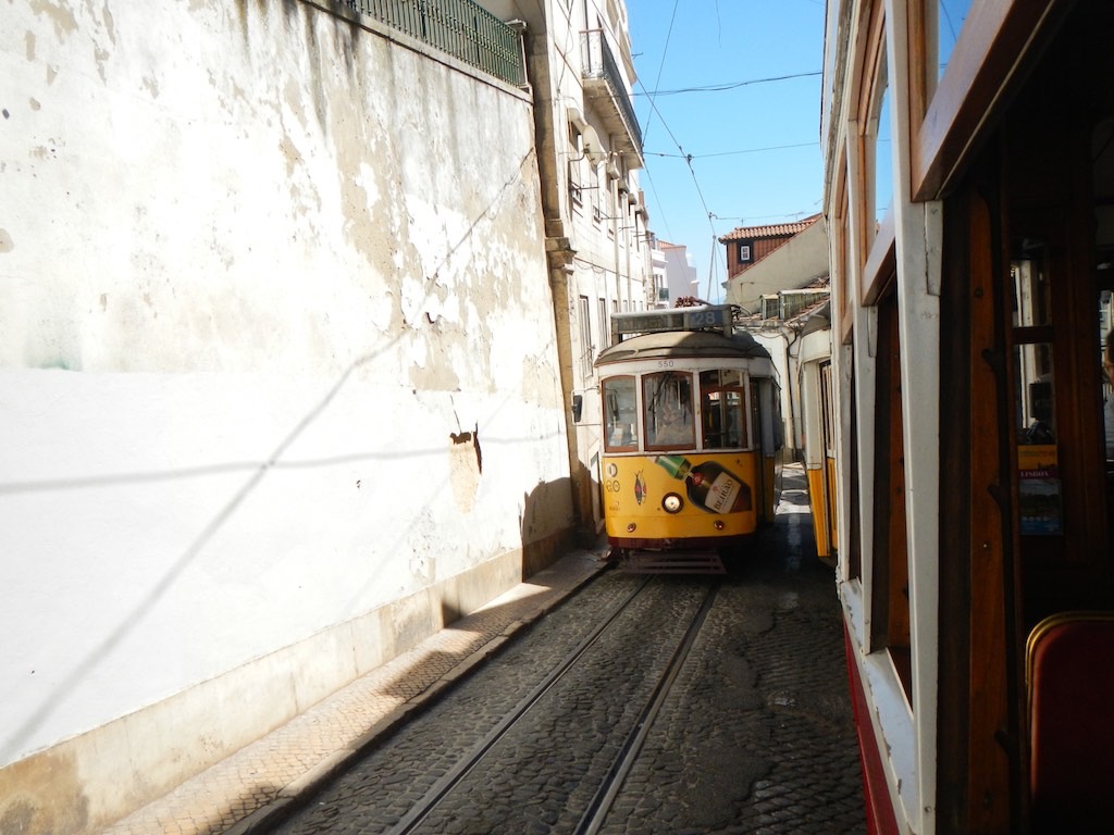 So fahren wir mal um den rechten Stadtteil, auf die Höhe und wieder runter, quer über die Rua Augusta und der anderen Seite wieder hoch. Einfach nur cool. Dabei sind wir froh, nicht selber durch die engen Gassen fahren zu müssen. Viel Platz haben die da nicht.