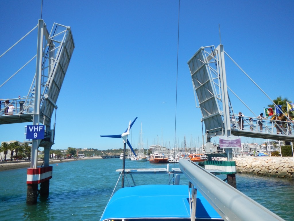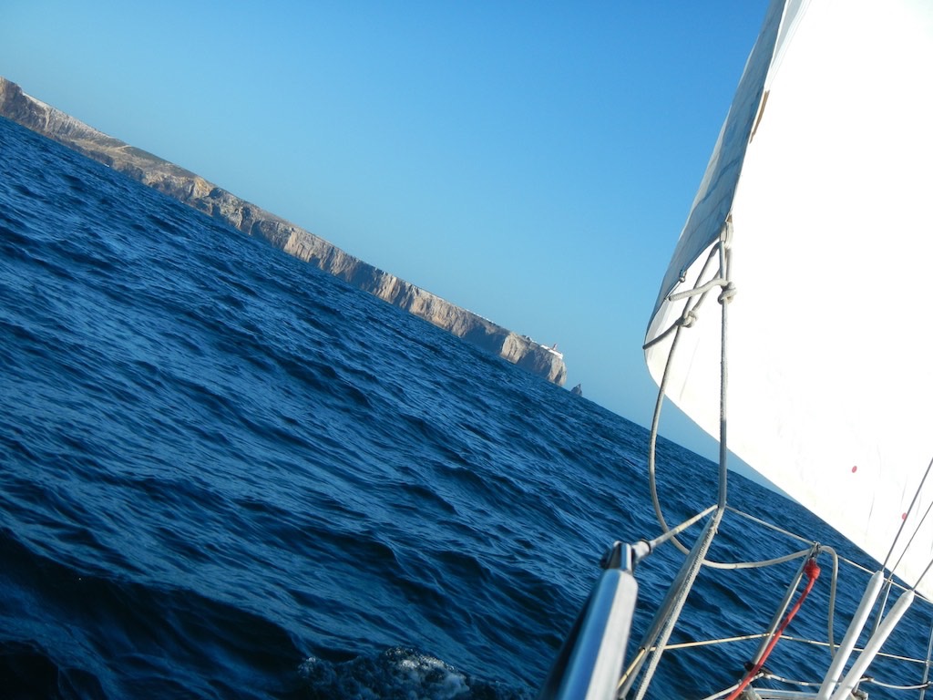 Dann auf einen Schlag fertig Wind! Null, gar nichts. Wir sind fast beim Kap von Lagos und der Wind macht einfach schlapp. Schade. Alles runter, Motor an und was ist das? Ein Mondfisch. Kaum zu glauben, ein richtiger Mondfisch. Die Attraktion im Lissabonner Aquarium! So jetzt aber bereitmachen für den Kanal zur Marina hoch.