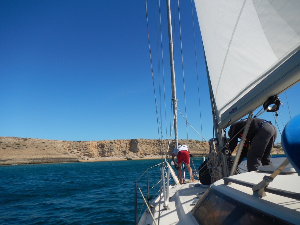 Wind? Etwas heftig, aber vor allem Wellen soll es heute geben. Das aber die Höhe nicht alles ist, erfahren wir kurz vor Sines. Diese typischen Atlantikwellen sind einfach mega lang und eigentlich trotz zwei Metern sehr angenehm. Sämi macht auf dem Vorschiff alles klar und so laufen wir kurz nach neun von Sesimbra aus.