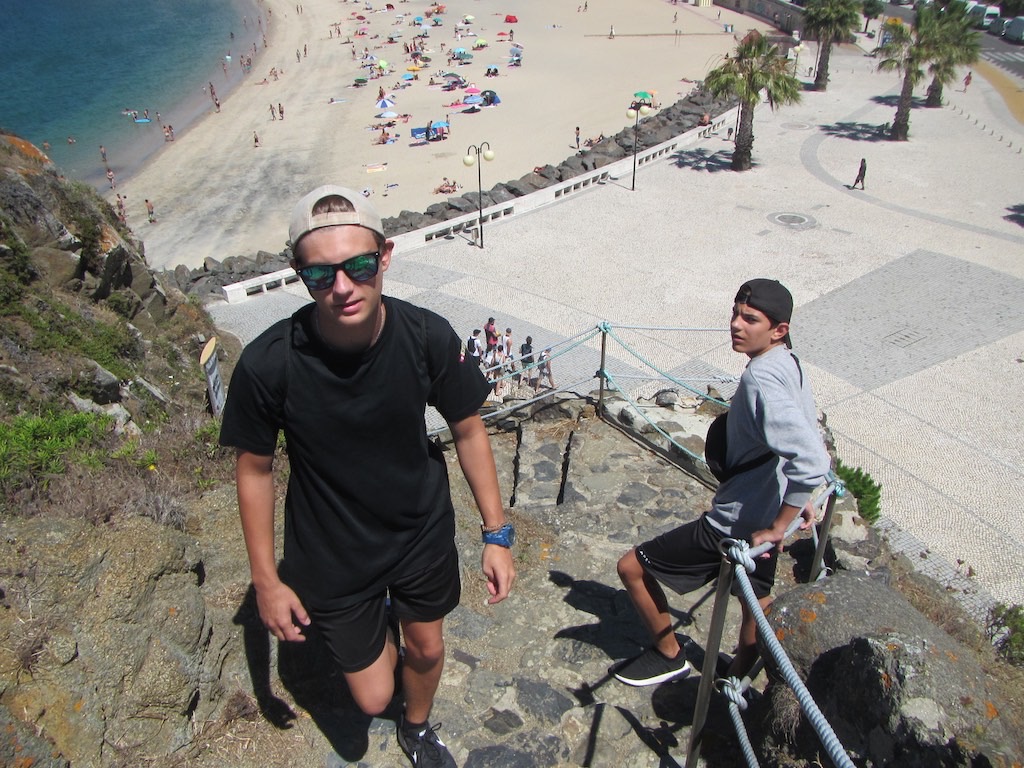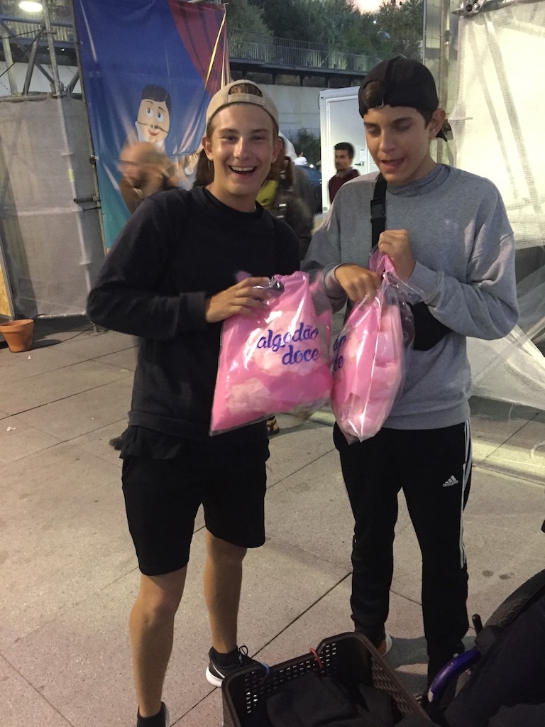 Wir laufen zur Stadt hoch und sehen ein Musikfestival. Dazu noch ein Dorf-Food-Festival zur gleichen Zeit. War das geplant? Zufall und wir dachten, endlich mal etwas Ruhe 😉 Im o’Beicinho lassen wir uns einen Bezuga bringen. Nur zwei, dies Mal und was kommt? Natürlich deren vier. Genial fein, aber einfach viel zu viel. Die anderen geniessen dabei ein Stück Fleisch. Die ganze Nacht hören wir den Sound vom Festival. Eintritte wollen, haben wir nicht, denn die Interpreten kennen wir einfach überhaupt nicht. Am nächsten Morgen wollen wir etwas länger schlafen. Endlich die mitgebrachte Post erledigen und ein paar eMails beantworten. Dann ab ins Dorf zum Supermarkt. Etwas die Vorräte aufstocken und einen feinen Kaffee in einer feinen Beiz geniessen. Leider sind wir Heute nicht die einzigen und die Schlange ist lang. Danke Sämi und Sile fürs Anstehen. Am Abend dann legen wir schon früh los. Wollen das Foodfestival mal etwas genauer ansehen und die diversen Spezialitäten auch geniessen. Jeder hat was gefunden. Sogar Zuckerwatte im Sack.
